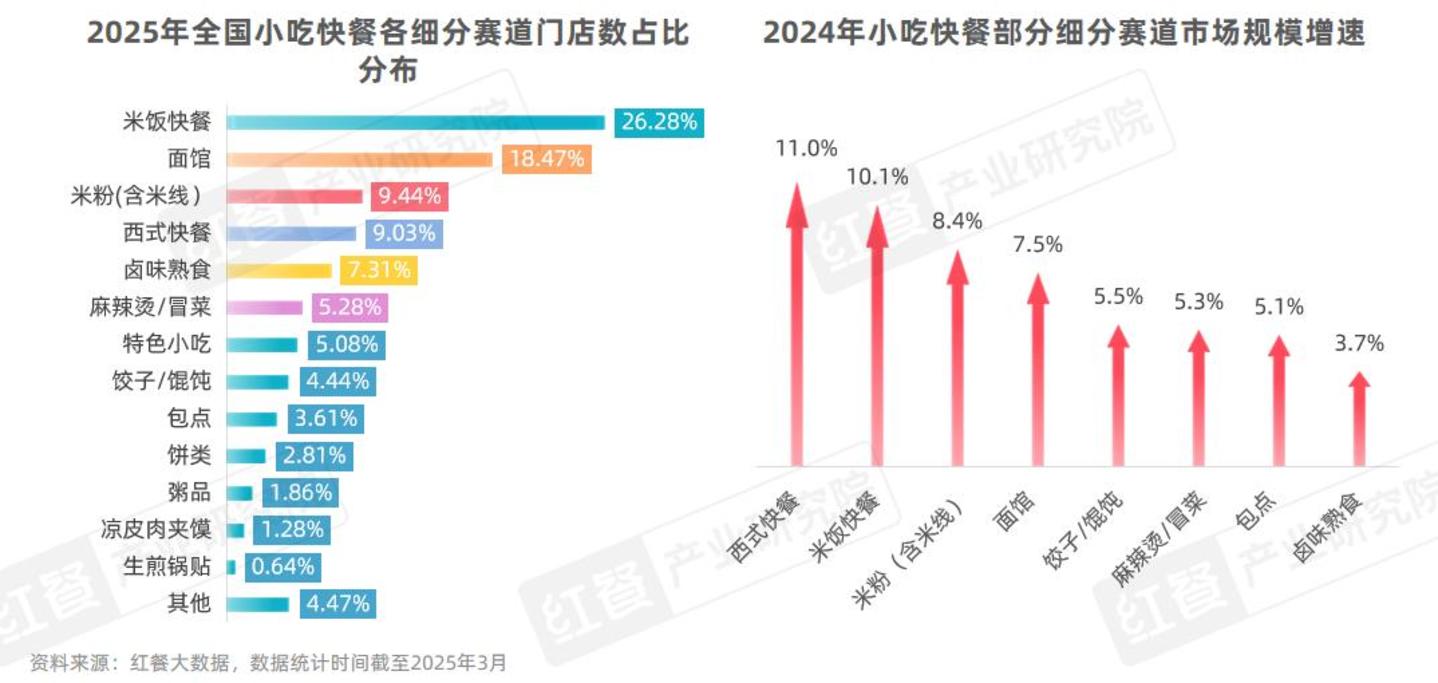 近年来,小吃快餐市场凭借其刚需属性强、消费频次高和广泛的受众基础,成为餐饮市场中除饮品外增长最快的细分品类。红餐大数据显示,2024年小吃快餐市场规模已突出1万亿元,同比增长7.5%。预计2025年其市场规模将进一步增长至1.08万亿元,与中式正餐市场规模旗鼓相当。