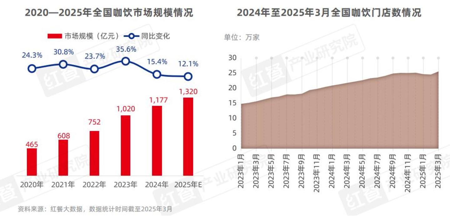 红餐大数据显示,2024年咖饮品类市场规模达到了1,177亿元,同比增长15.4%,增速较2023年下降了20.2个百分点。随着市场竞争的加剧,咖饮品类增速将继续回落,2025年市场规模预计为1,320亿元。