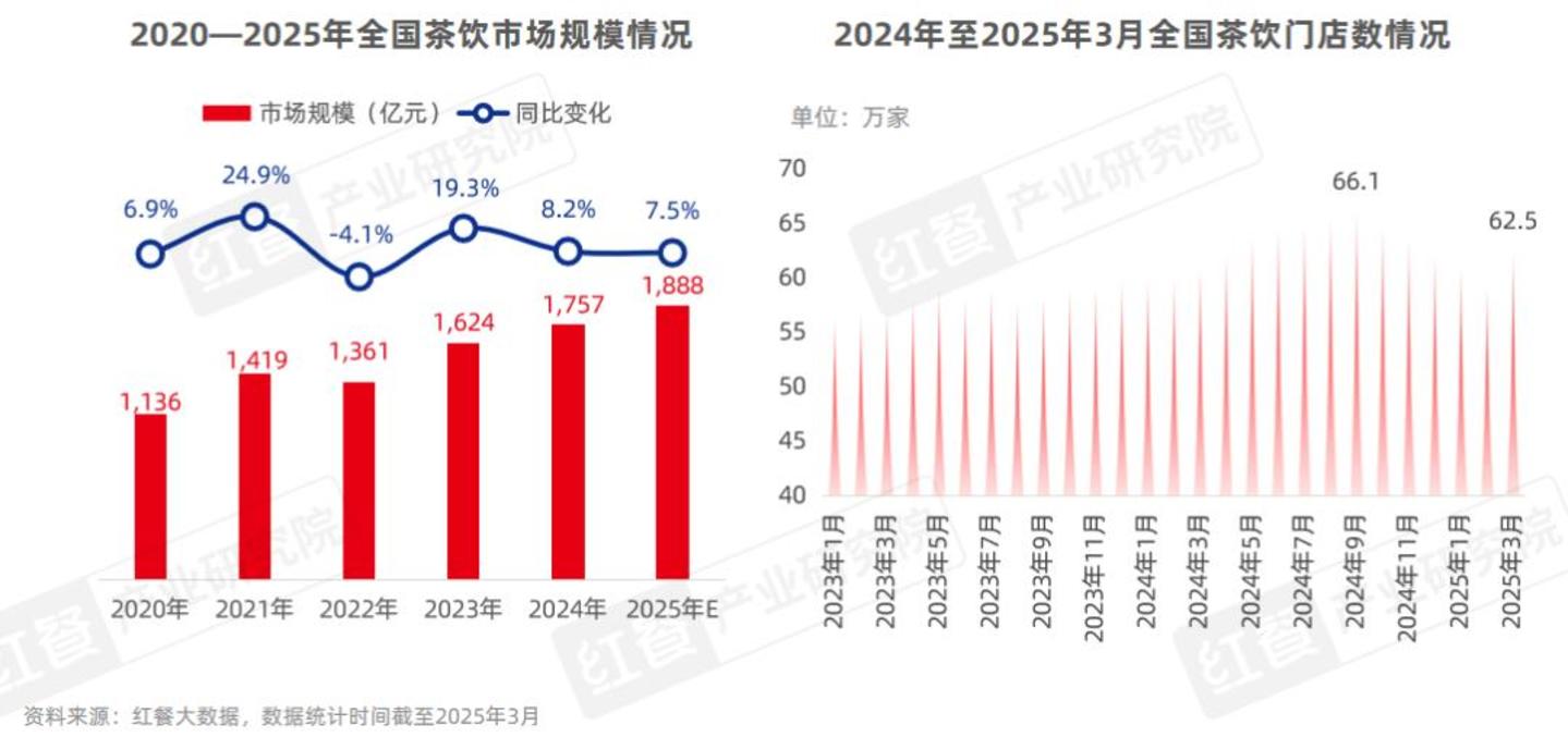 2024—2025年,茶饮赛道已经进入了洗牌调整阶段,总门店数呈先增后降的趋势。红餐大数据显示,截至2025年3月,全国茶饮门店总数为62.5万家,较2024年9月的峰值减少了3万余家。