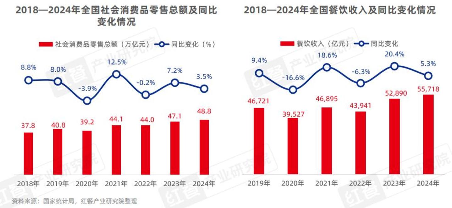 然而,餐饮行业作为消费市场的重要组成部分,却呈现出不俗的表现。2024年全国餐饮收入接近5.6万亿元,同比增长5.3%,增速比社会消费品零售总额高出1.8个百分点,充分展现了餐饮行业的韧性以及其对整体消费市场的显著贡献。