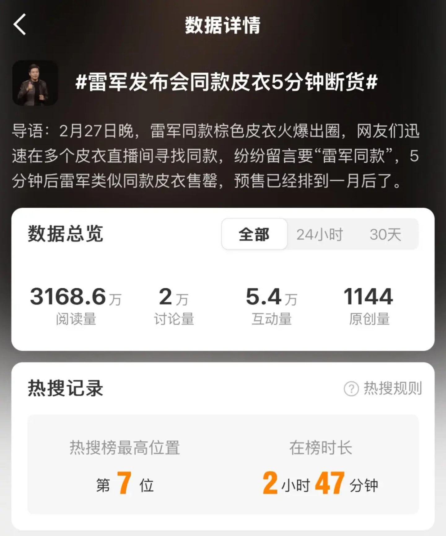 尽管“雷军同款皮衣卖断货”的微博热搜全网阅读量已经超过3168.6万,但对于像小泽这样的中小体量商家而言,盲目跟风去卖皮衣并不是个好选择。