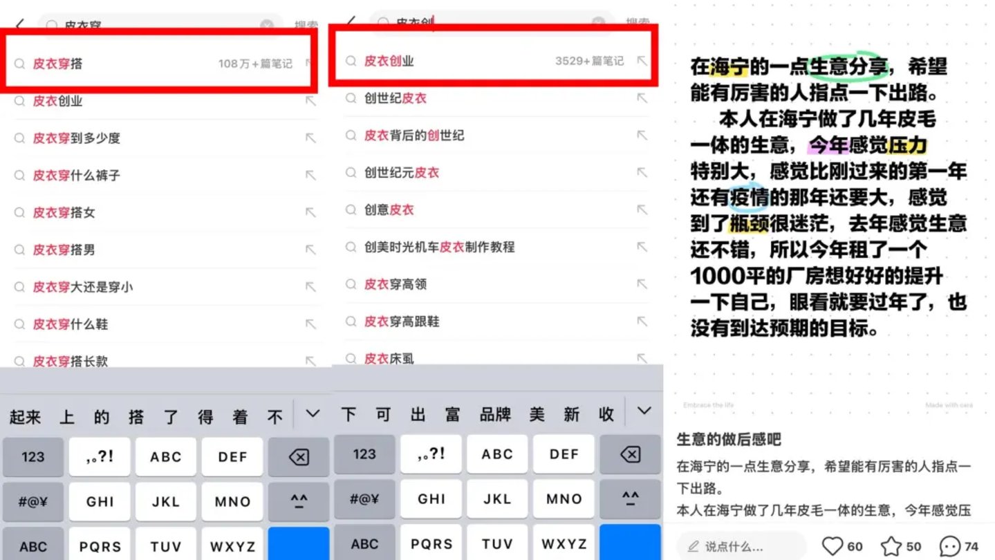 在小红书上,关于“皮衣穿搭”的笔记已经有了108多万篇,但与之相对的是,在3500多篇关于皮衣创业的帖子中,“不赚钱”、“压力大”等关键词被推荐到了热度前排。
