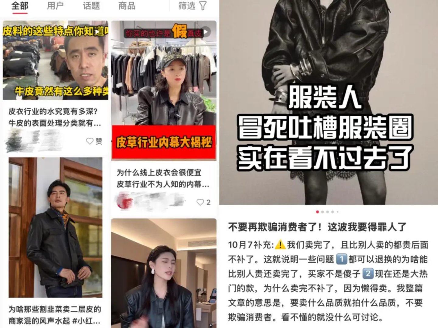 作为一个价格可下探到500元以下、也能摸高到3000元以上的品类,皮衣依旧是一个没有明确统一质量标准的品类,这也是不少创业者吐槽“行业水深”、“生意不好做”的最大原因之一。在小红书平台上,不少商家发帖吐槽称同行换皮欺骗消费者,砸坏行业口碑。