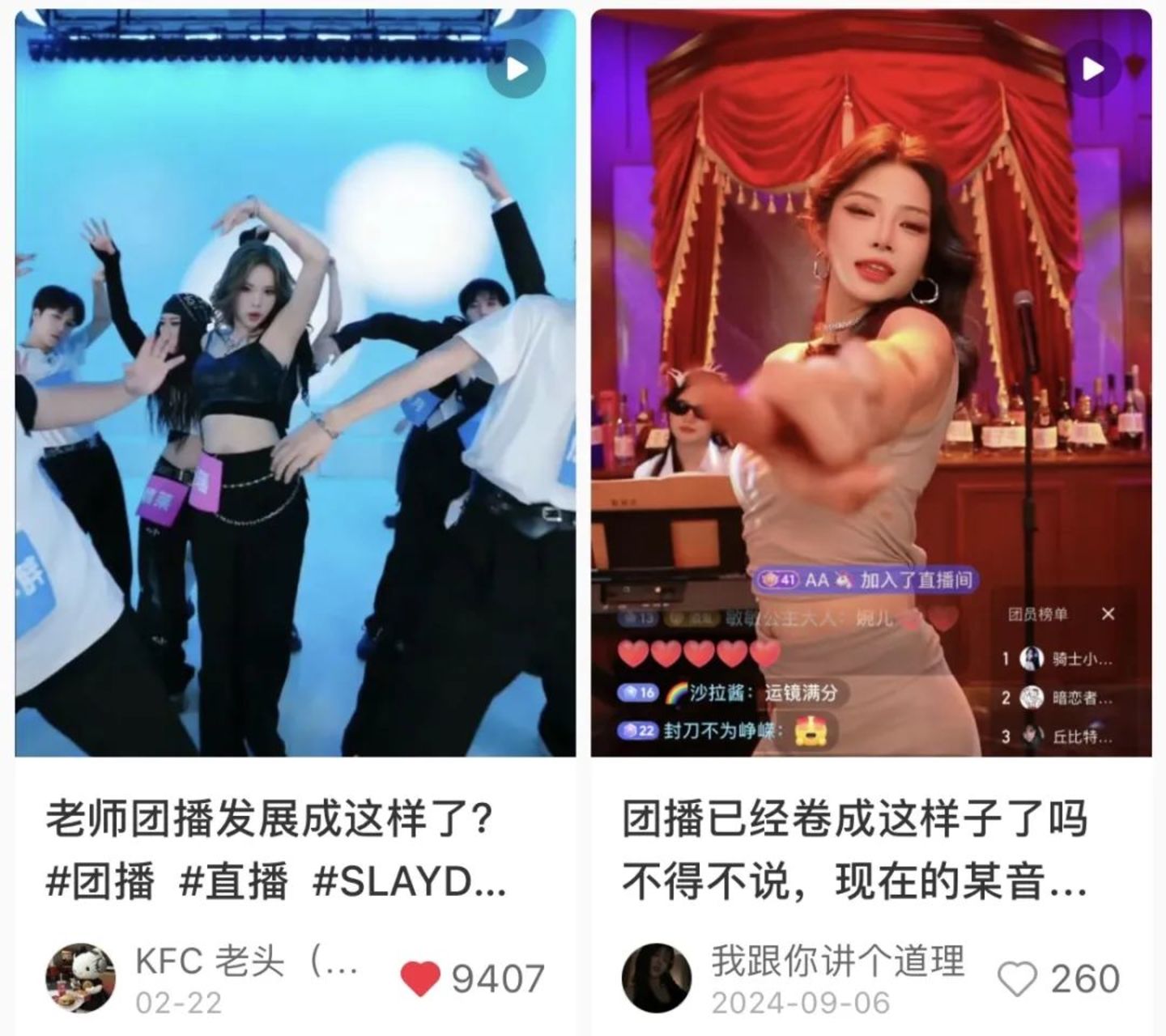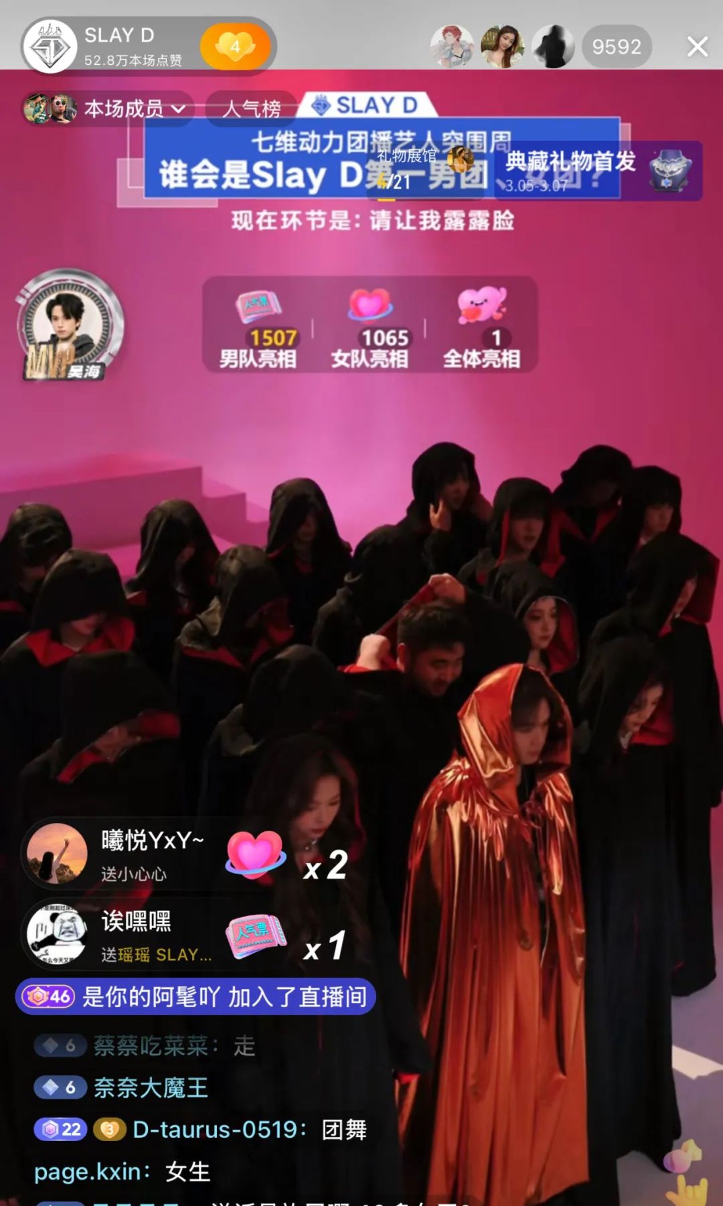 打开抖音直播间,屏幕中22位穿着深色斗篷的年轻男女正在随着音乐有节奏地摇摆。这不是某种神秘仪式或科幻电影片场,而是让网友感叹「团播已经卷成这样了吗」的SLAY D的团播舞台。每当有观众为指定主播送出礼物后,被选中的团员便能解锁一段个人solo舞蹈秀,每当单场点赞量达到一定体量,还会解锁不同团舞。