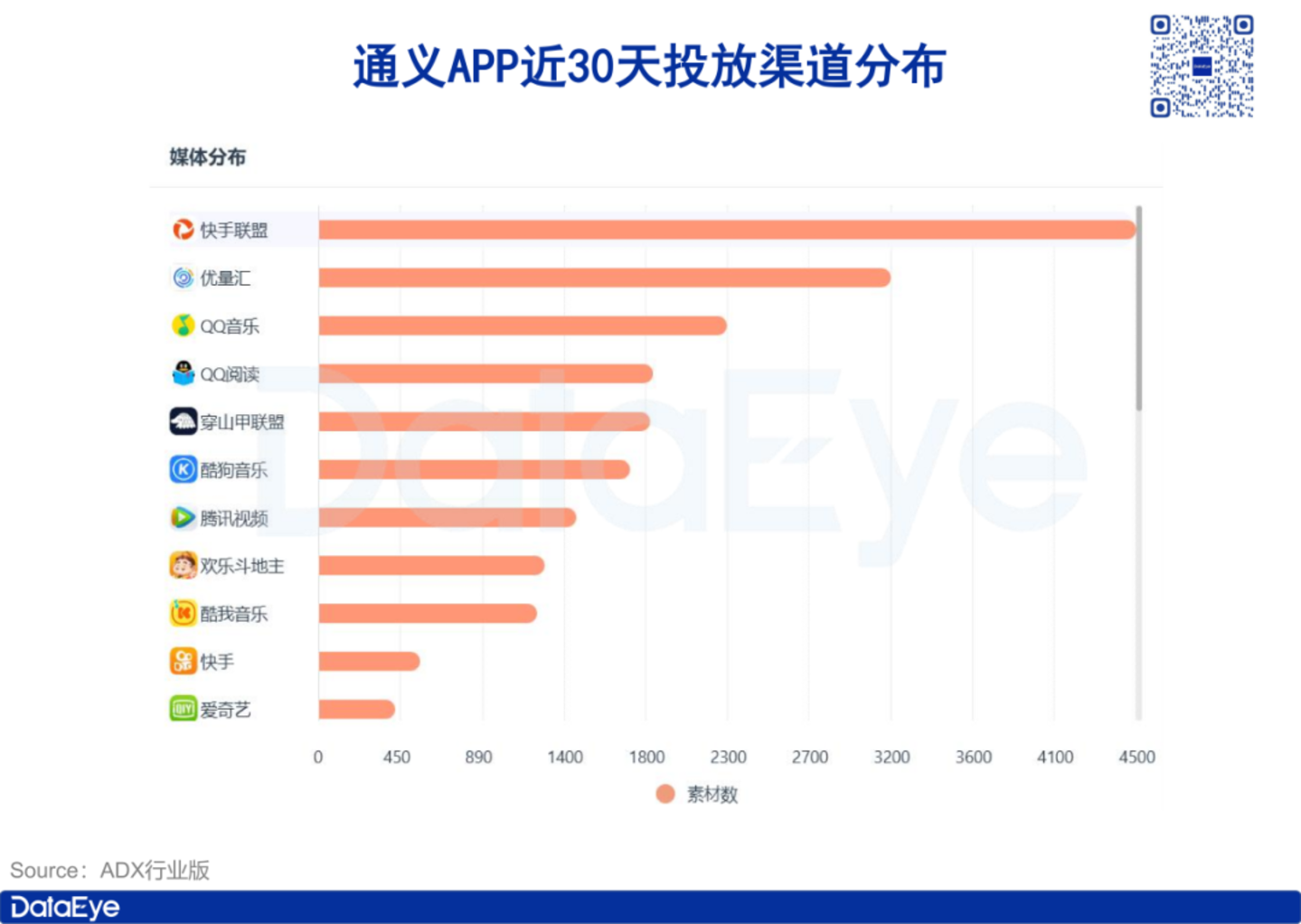 ADX行业版数据显示,近30天通义APP投放渠道以快手联盟为核心,优量汇、QQ音乐、QQ阅读、穿山甲联盟、酷狗音乐等紧随其后。整体来看,各渠道投放素材量分布相对比较均衡。