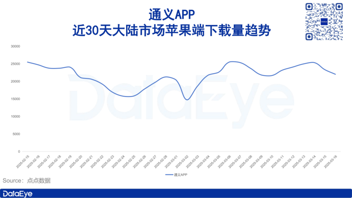 点点数据显示,近30天,通义APP大陆市场苹果端下载量趋势较为平稳。除2月底3月初下载量陷入相对低谷(日下载量约1.5万次)之外,整体日下载量均维持在2.5万组左右,无明显波动。
