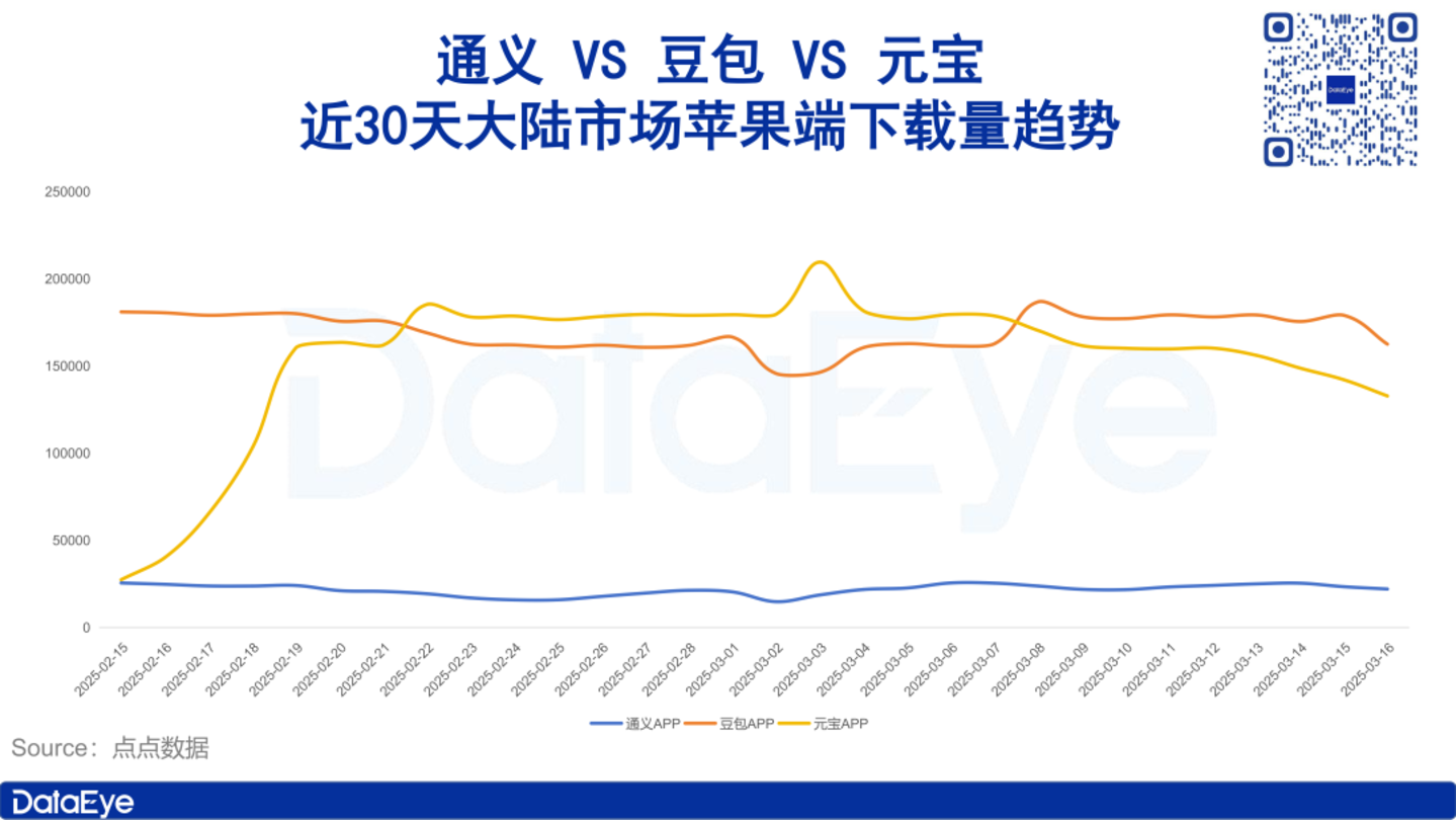 点点数据显示,2月15日腾讯元宝APP下载量偏低,但上升趋势明显,至2月19日基本已与豆包APP处在同一下载量水平,持续至今。
