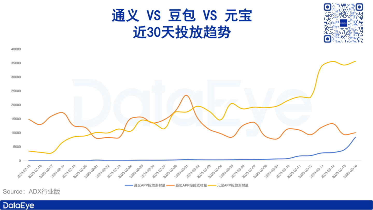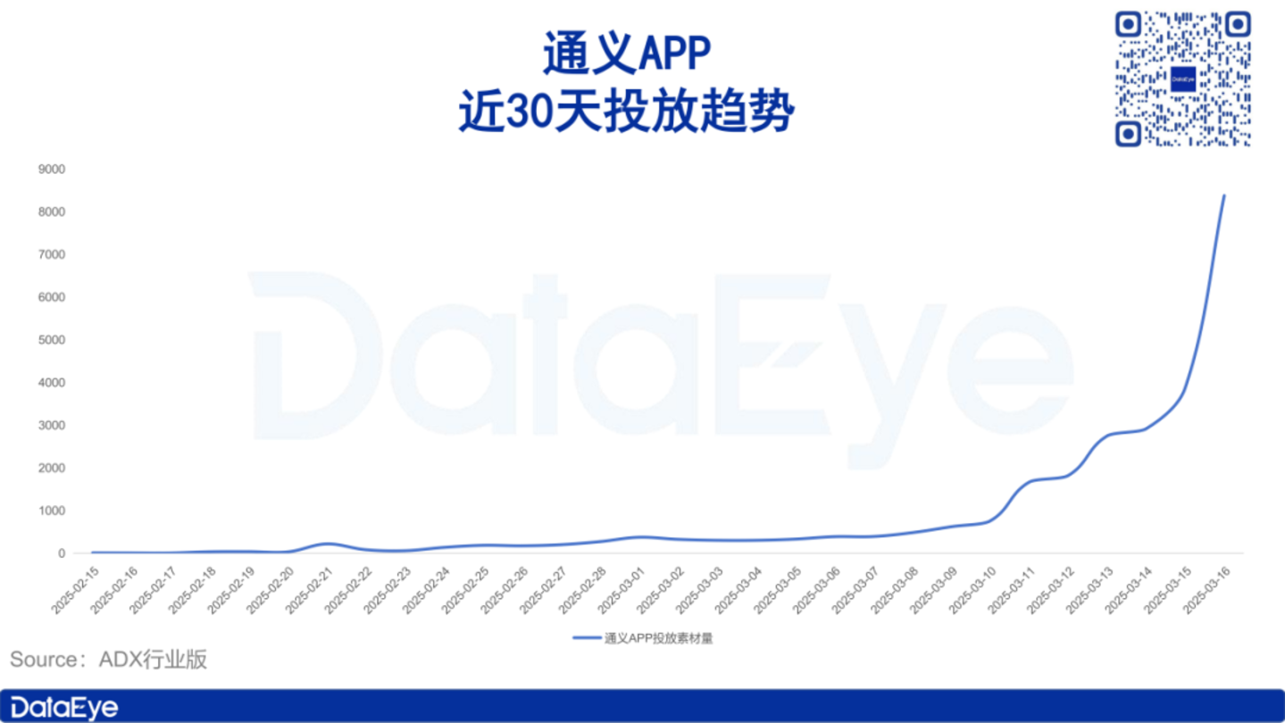 DataEye研究院注意到,继腾讯元宝加大营销力度、登顶App Store应用榜首后,阿里旗下通义APP同样开始发力,投放素材量直线拉升。