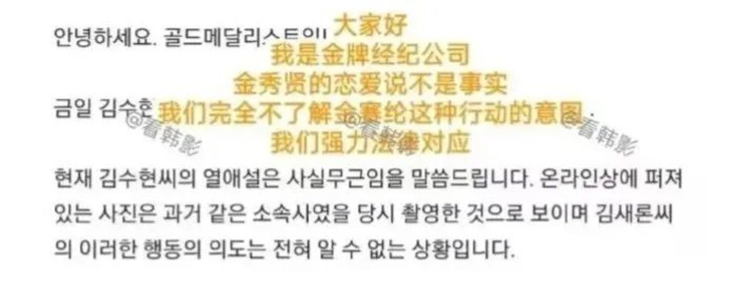 因为在去年《眼泪女王》剧播期间,金赛纶曾在社交账号上传自己与金秀贤的贴脸合照,金秀贤方火速回应,称“恋爱传闻毫无根据”“完全无法得知金赛纶意图”。