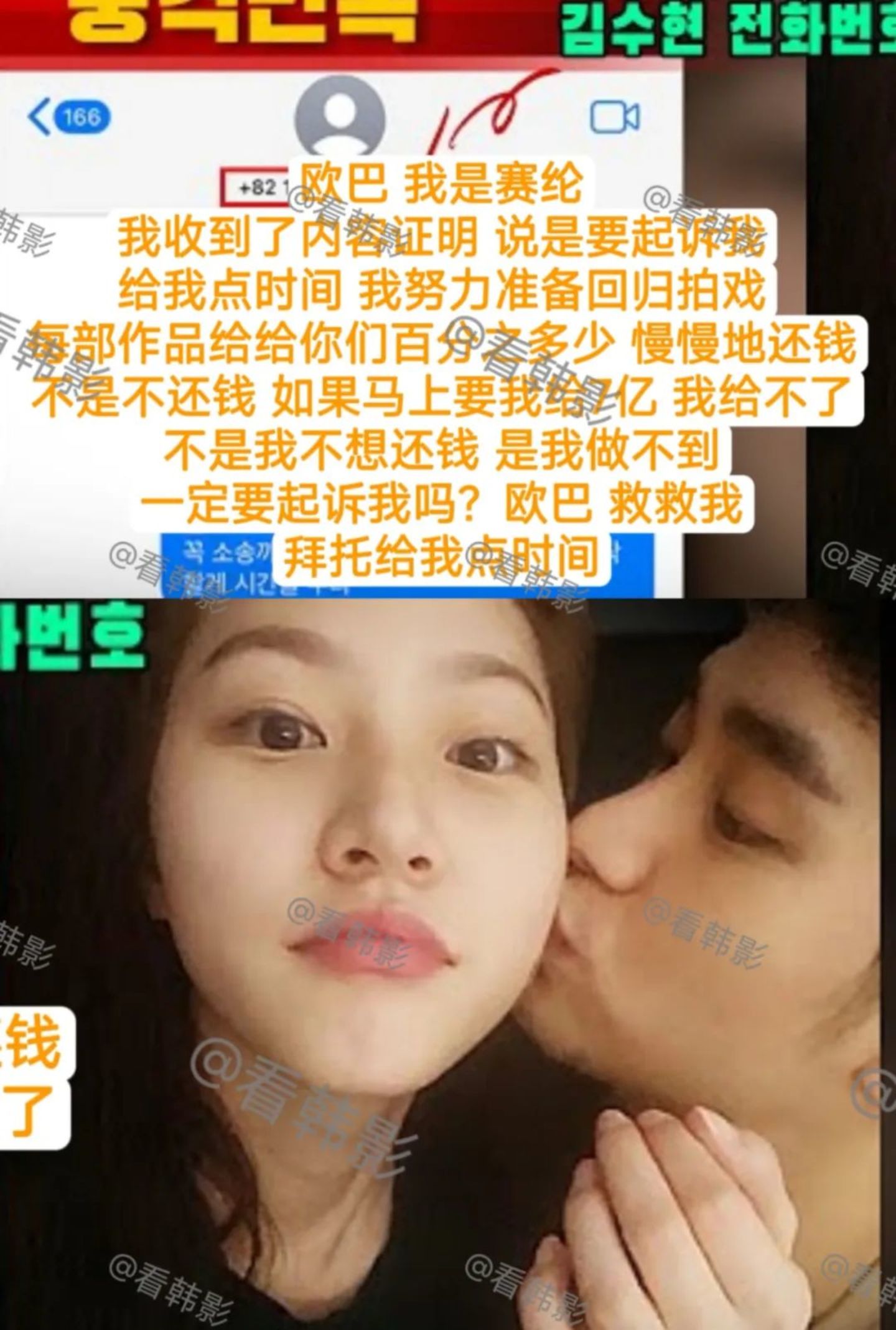 收到存证信函的金赛纶第一时间给金秀贤发去了短信,称“不是不想还钱,是马上要我给7亿,我给不了,给我点时间,每部作品给你们分成,慢慢还钱”。