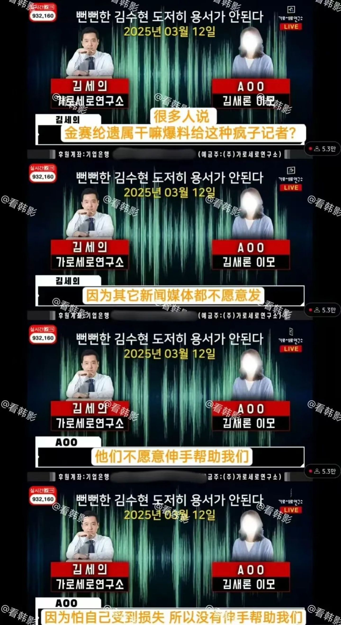此次名义上是为金赛纶发声,但金世毅每次出镜都头戴“反对弹劾”的头巾,爆料中穿插大量为总统尹锡悦站台言论,令人咋舌。