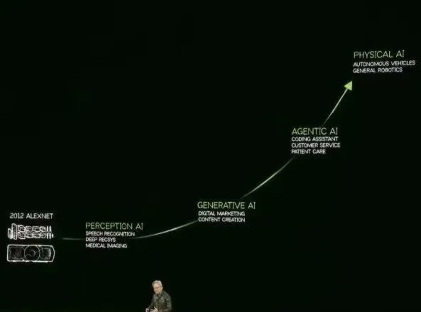 这里要提一下,老黄认为AI的发展分为四个阶段:感知人工智能(Perception AI)、生成式人工智能(Generative AI)、代理人工智能(Agentic AI)和未来的物理 AI(Physical AI)。而现在我们正处于代理人工智能阶段。