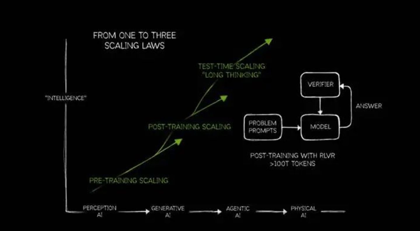 现在他将Scaling Law细化为PRE-TRAINING SCALING、POST-TRAINING SCALING、TEST-TIME SCALING三个部分。老黄的意思是,随着AI进入到不同阶段,对Scaling的需求是不断提高的。