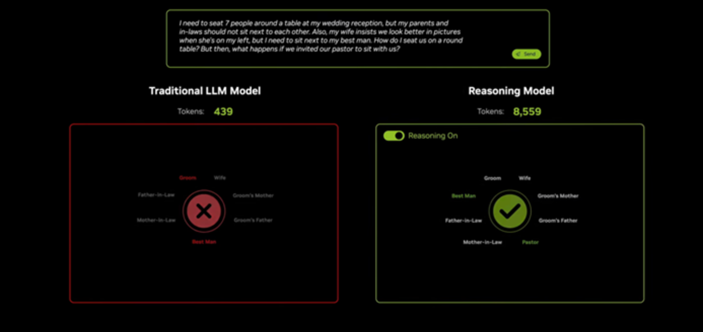 这就是老黄坚信Scaling Law没有失效的底气。在会上,老黄用传统模型Llama 3.3 70B与DeepSeek R1 671B进行了对比,统一回答一个复杂问题。最终前者消耗了400多个token但结果不可用,后者的结果堪称完美,但足足消耗了8559个token。