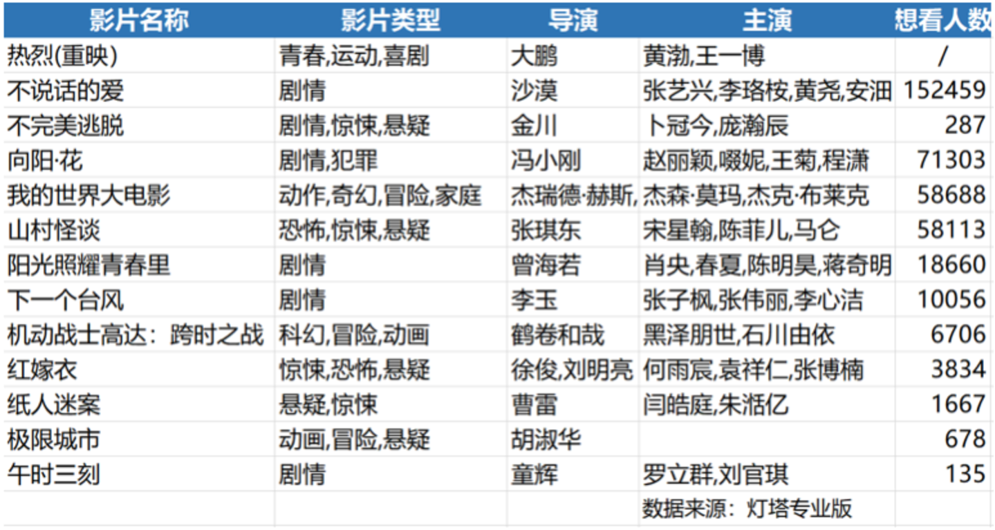抛开重映的《热烈》和明显炮灰的几部“网大再就业”之外,本次清明档有一定票房空间的影片主要有六部:《向阳·花》《不说话的爱》《我的世界大电影》《阳光照耀青春里》《机动战士高达:跨时之战》《下一个台风》。