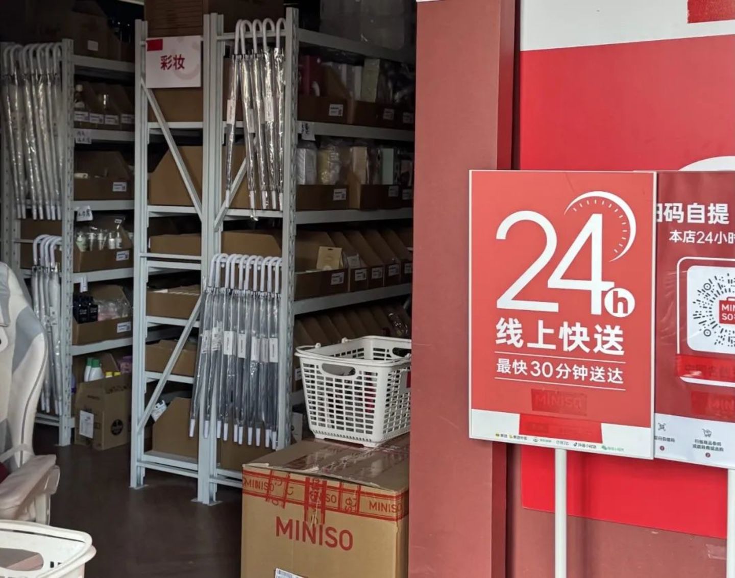 剁椒 Spicy 实地走访了北京朝阳百子湾的一家 “名创优品 24 小时超级店”。这家店铺位于居民区深处,极为隐蔽,经过多方询问过往居民,才找到其确切位置。店门口张贴着醒目的 “扫码自提,立刻带走” 标识,不对外营业,店内约六十平米的空间内,货架紧密排列,满满当当。