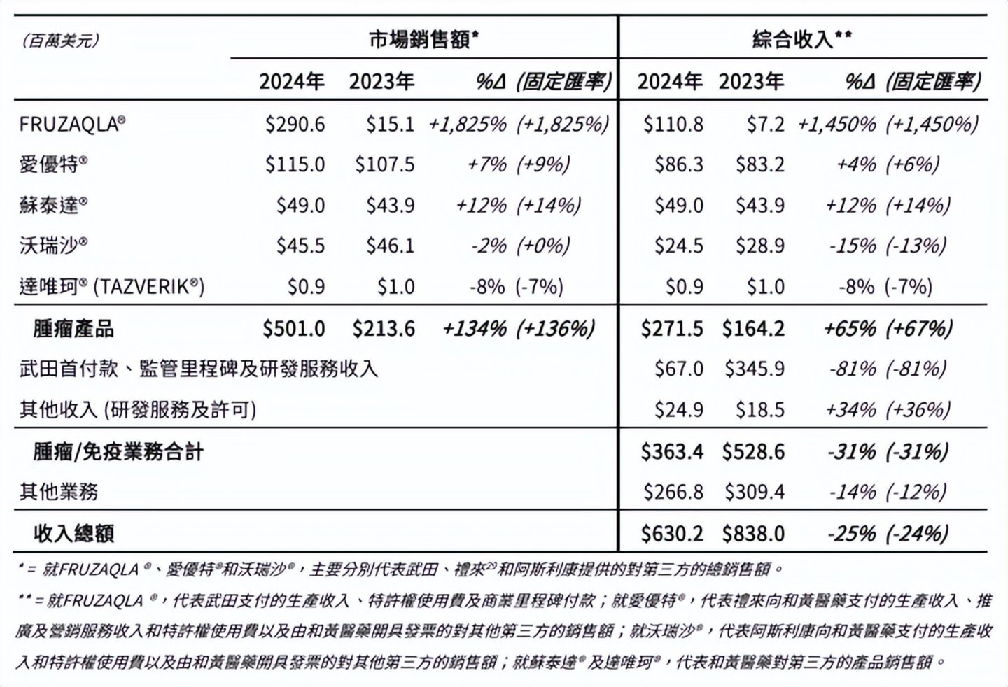 财报显示,2024年,和黄医药肿瘤产品市场销售额增长134%(按固定汇率计算为136%)至5.01亿美元(2023年:2.136亿美元)。得益于此,肿瘤产品综合收入强劲增长65%(按固定汇率计算为67%)至2.715亿美元(2023年:1.642亿美元)。