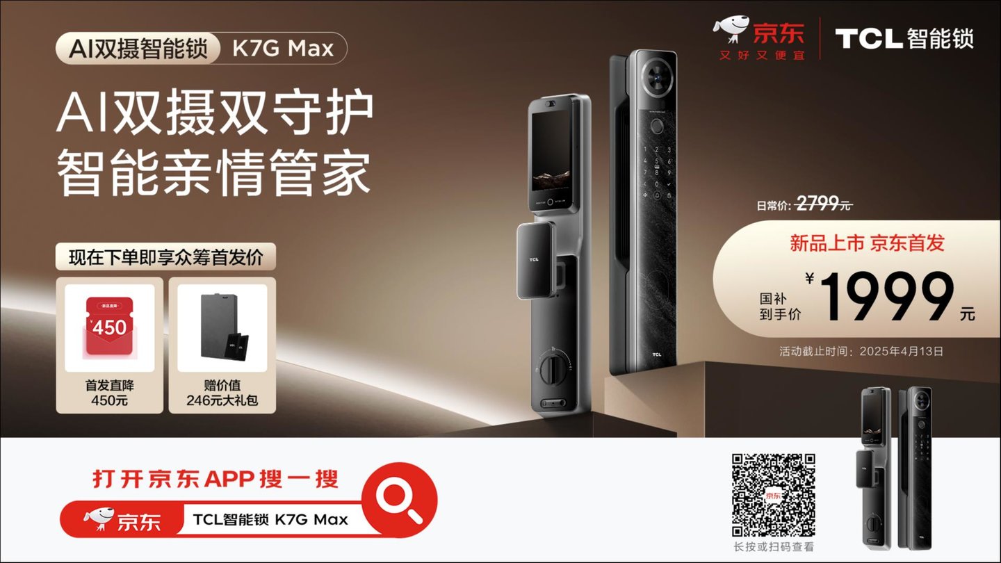 至此,AI+3D人脸猫眼锁的全新时代已由TCL智能锁领衔开启。作为京东智能锁品类核心战略伙伴,将于3月20日携年度旗舰闪电新品K7G Max登陆京东独家首发,基于京东超3亿智能家庭用户数据反哺产品研发,双方共建"研发-生产-服务"全链路数字化生态,首发价格2799元,TCL新品,尽在京东,打开京东APP搜TCL K7G Max智能锁,享新品众筹早鸟价立减到手仅需1999元,解锁未来生活新范式。