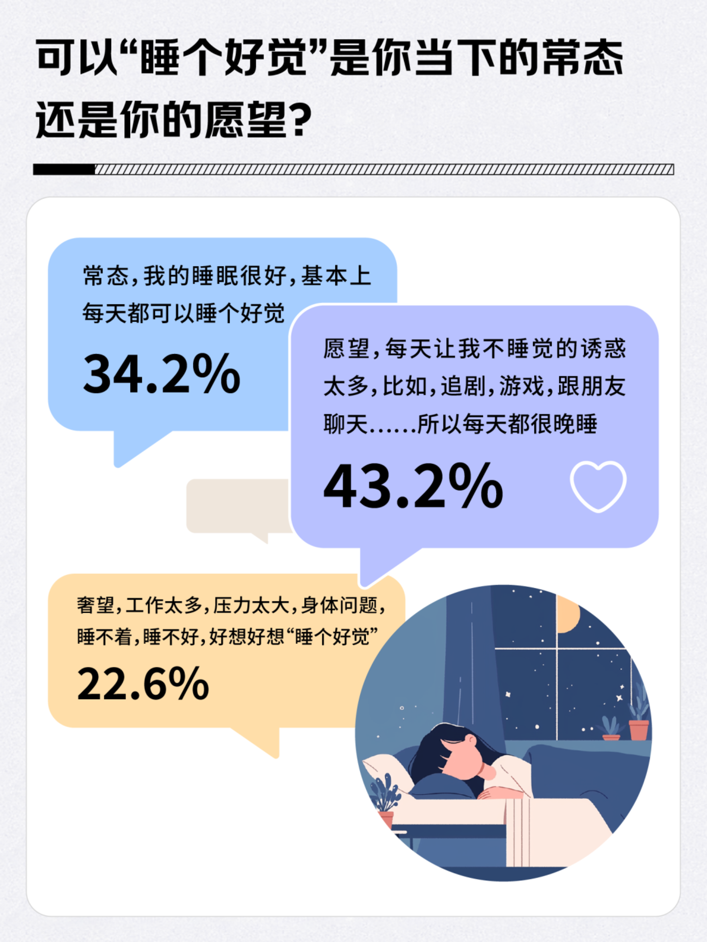 在京东消费及产业发展研究院的调研中,43.2%的人表示“睡个好觉”是一种愿望,“每天让我不睡觉的诱惑太多,比如追剧、游戏、跟朋友聊天……所以每天都很晚睡”,还有22.6%的人认为是一种奢望,“工作太多,压力太大,身体问题,睡不着,睡不好,好想好想睡个好觉”。