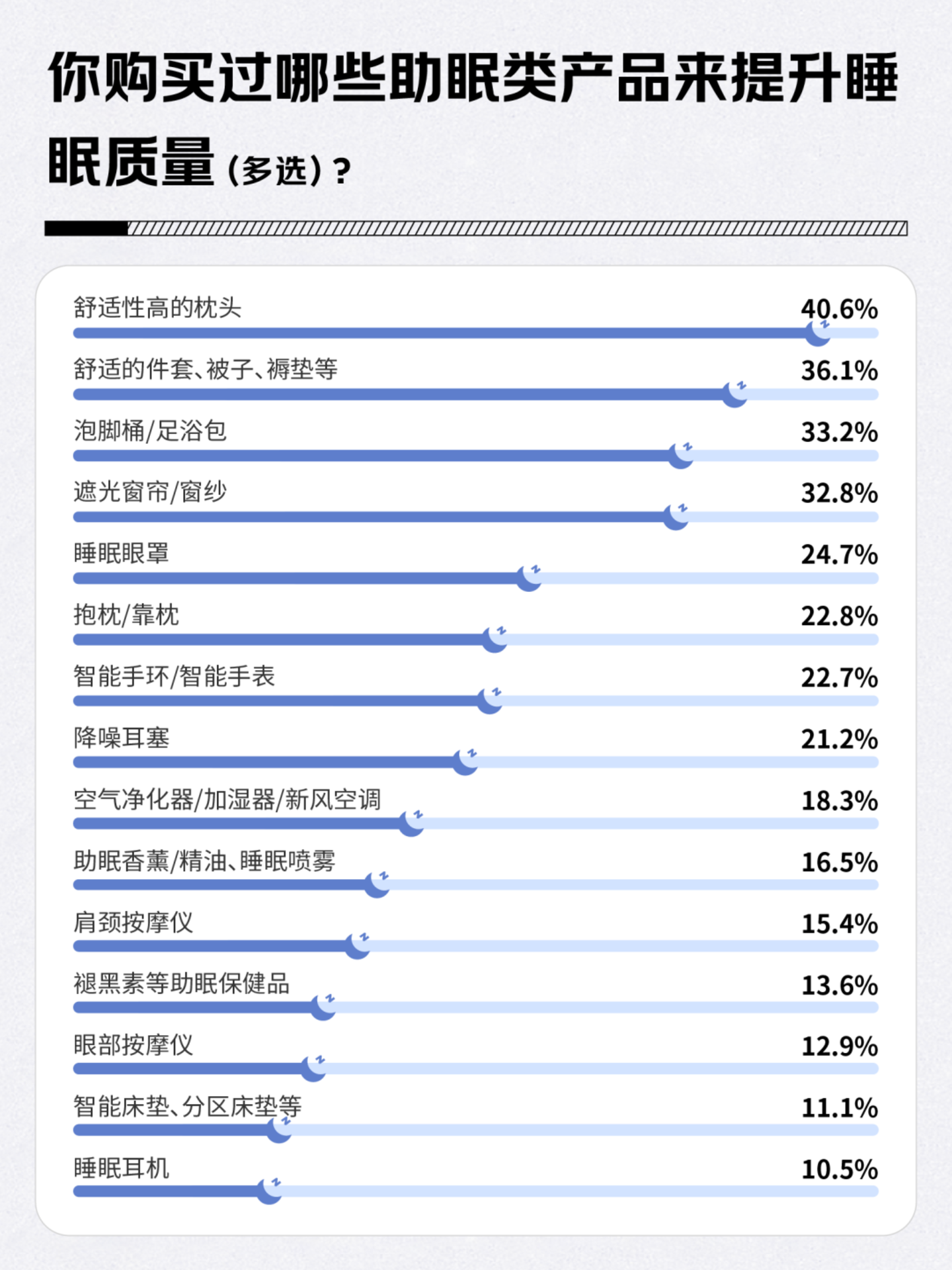 41.3%的人选择舒适性高的枕头让自己“睡个好觉”,36.6%的人选择舒适的四件套、被子等,还有31.2%的人选择遮光窗帘或窗纱。京东数据显示,2024年酒店睡感床垫成交额同比增长超100%,智能床垫同比增长80%,软管枕、记忆枕成交额分别增长159%、77%。