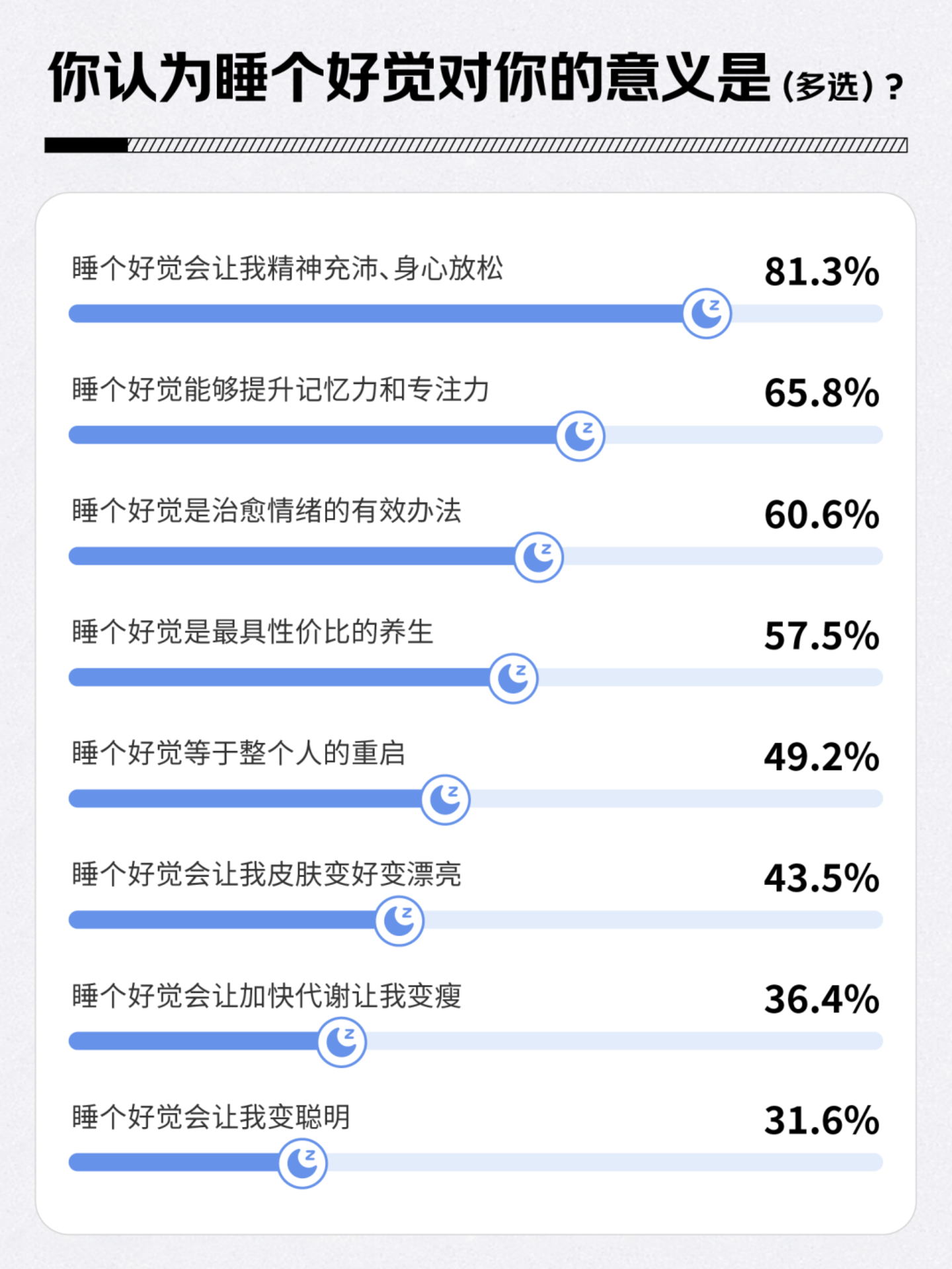 在他们看来,“睡个好觉”犹如万能解药:81.3%的人认为“睡个好觉”能让人精力充沛、身心放松,65.8%的人认为能够提升记忆力和专注力,还有治愈情绪(60.6%)、最具性价比的养生(57.5%)、整个人的重启(49.2%)也是“睡个好觉”带来的正向价值。