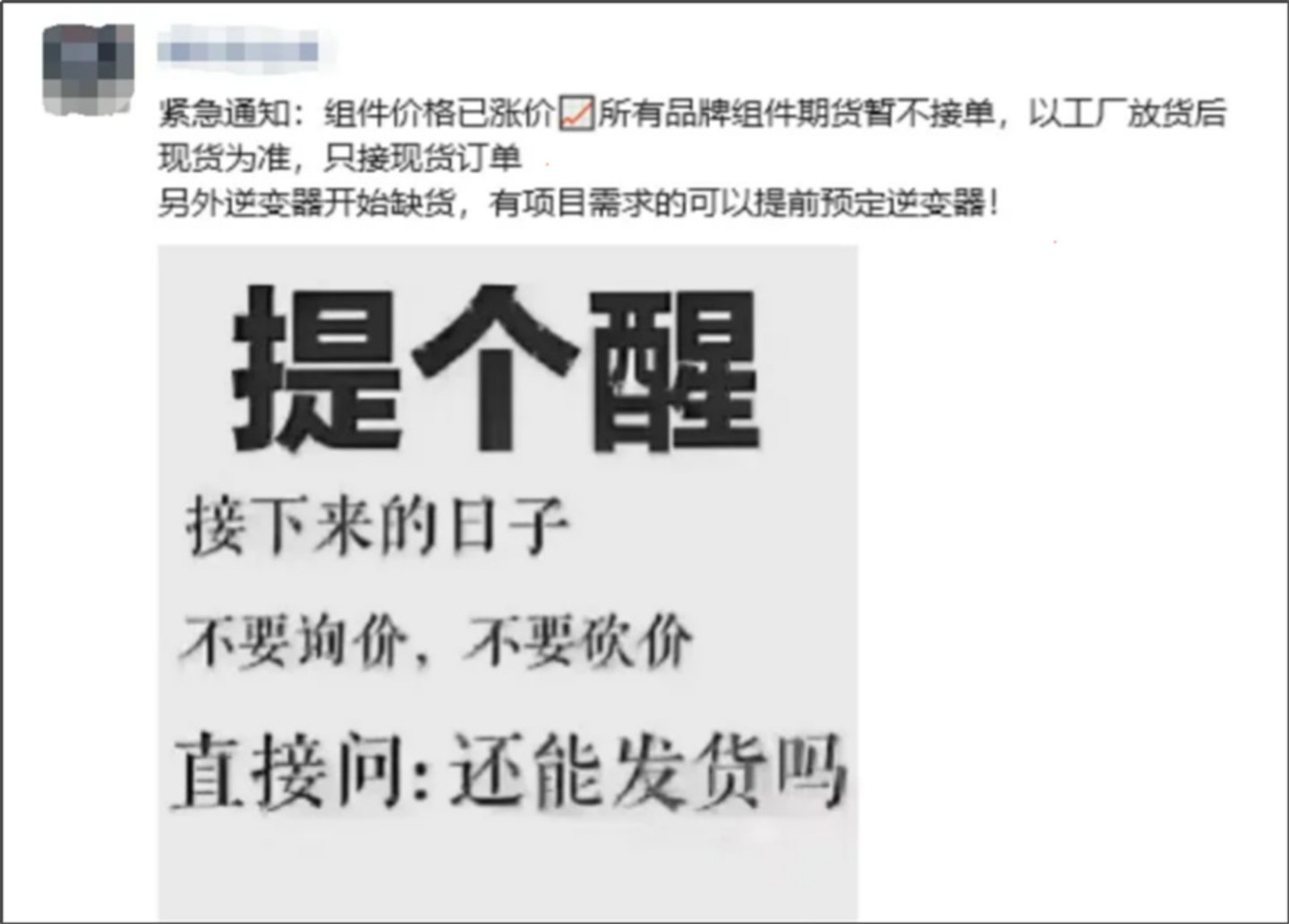 网上流传的一个贸易商朋友圈截图显示,所有品牌组件期货都已暂停接单,只接现货订单,并提醒“不要询价,不要砍价,直接问:有货吗?”