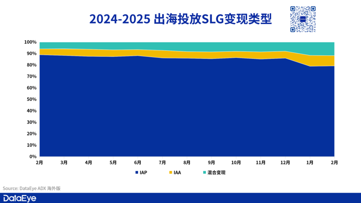 从出海投放SLG变现类型占比来看,IAP处于绝对地位,始终保持着高于80%的占比,在2024年最高时逼近90%。