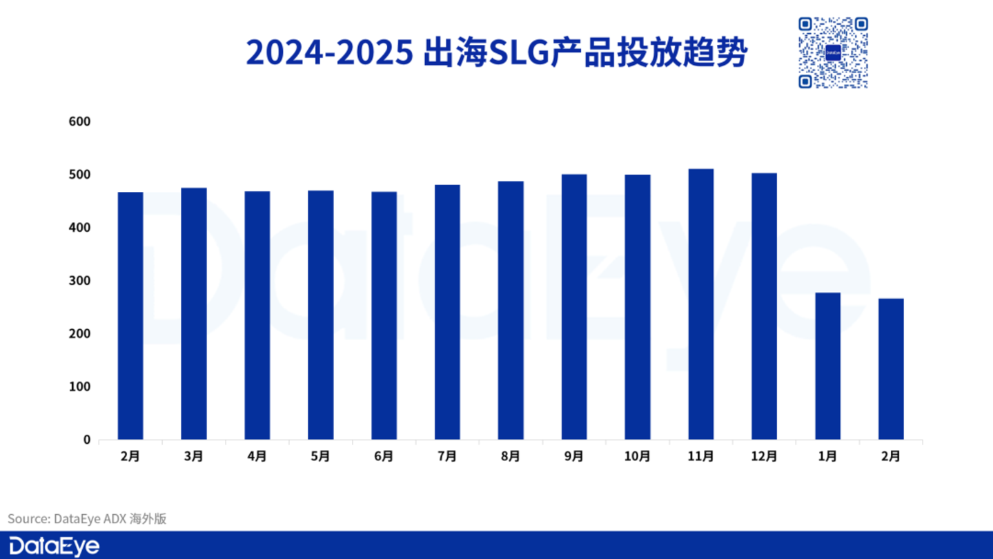 数据监测波动:Google Play和App Store都在2025年开年两个月进行了大规模的应用下架,导致各品类都出现投放产品骤减的情况。许多SLG都以超休闲或其他游戏形态出现,SLG玩法往往藏在中后期,市场上实际投放的SLG游戏数量要比被监测到的更多。