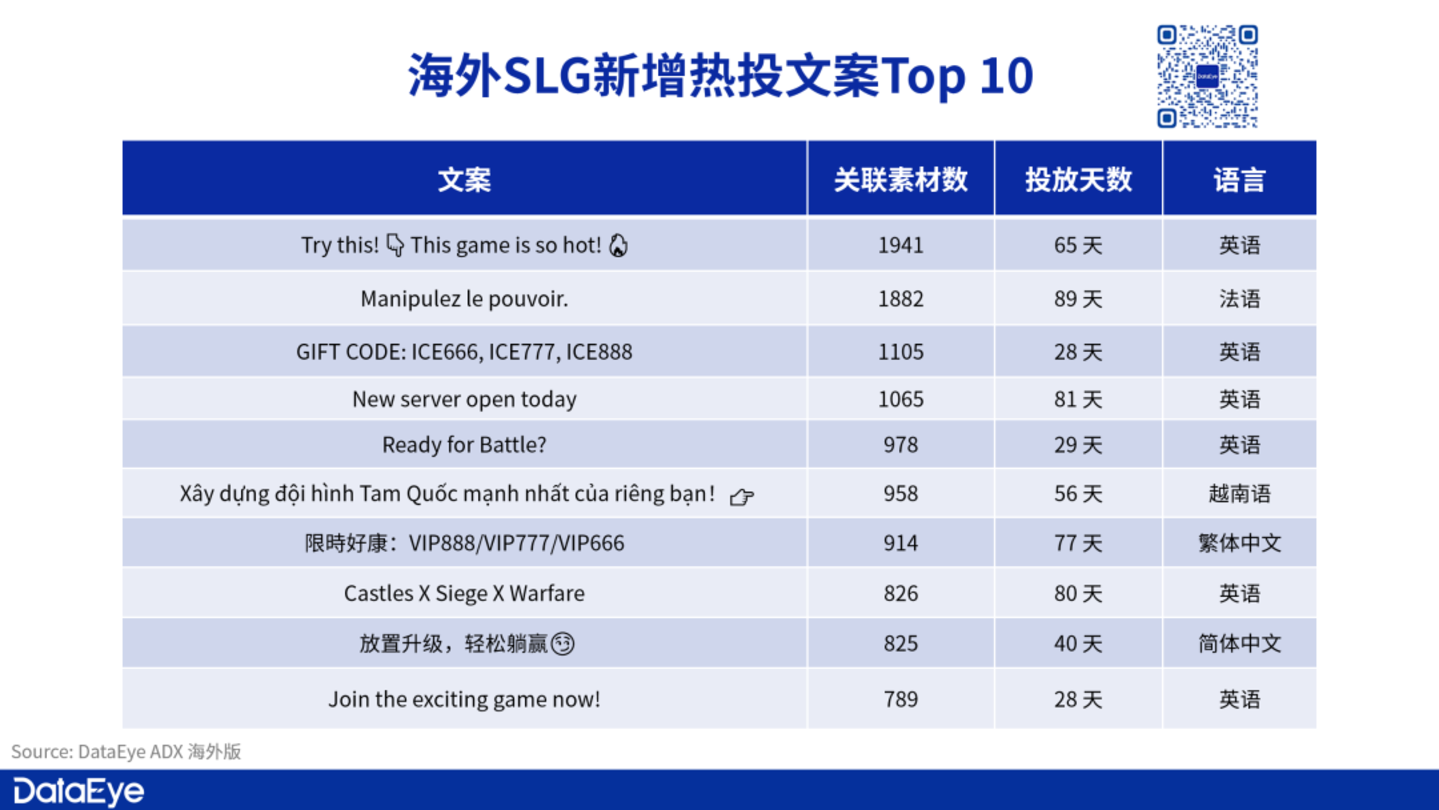 在DataEye ADX海外版展示的近90天海外投放SLG素材Top 100高频词中,“strategy”以1070组关联文案数居首,出现频率最高。
