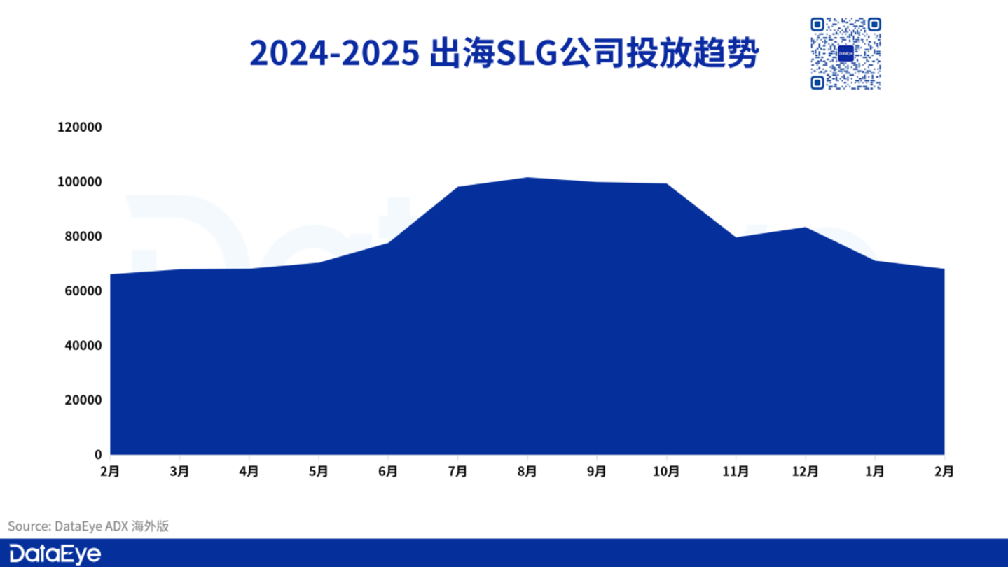 时间段内出海SLG的投放高峰出现在去年的7-10月份,最高位突破单月10万组素材。2025年伊始出海SLG的投放量月均为7万组,与去年上半年持平。