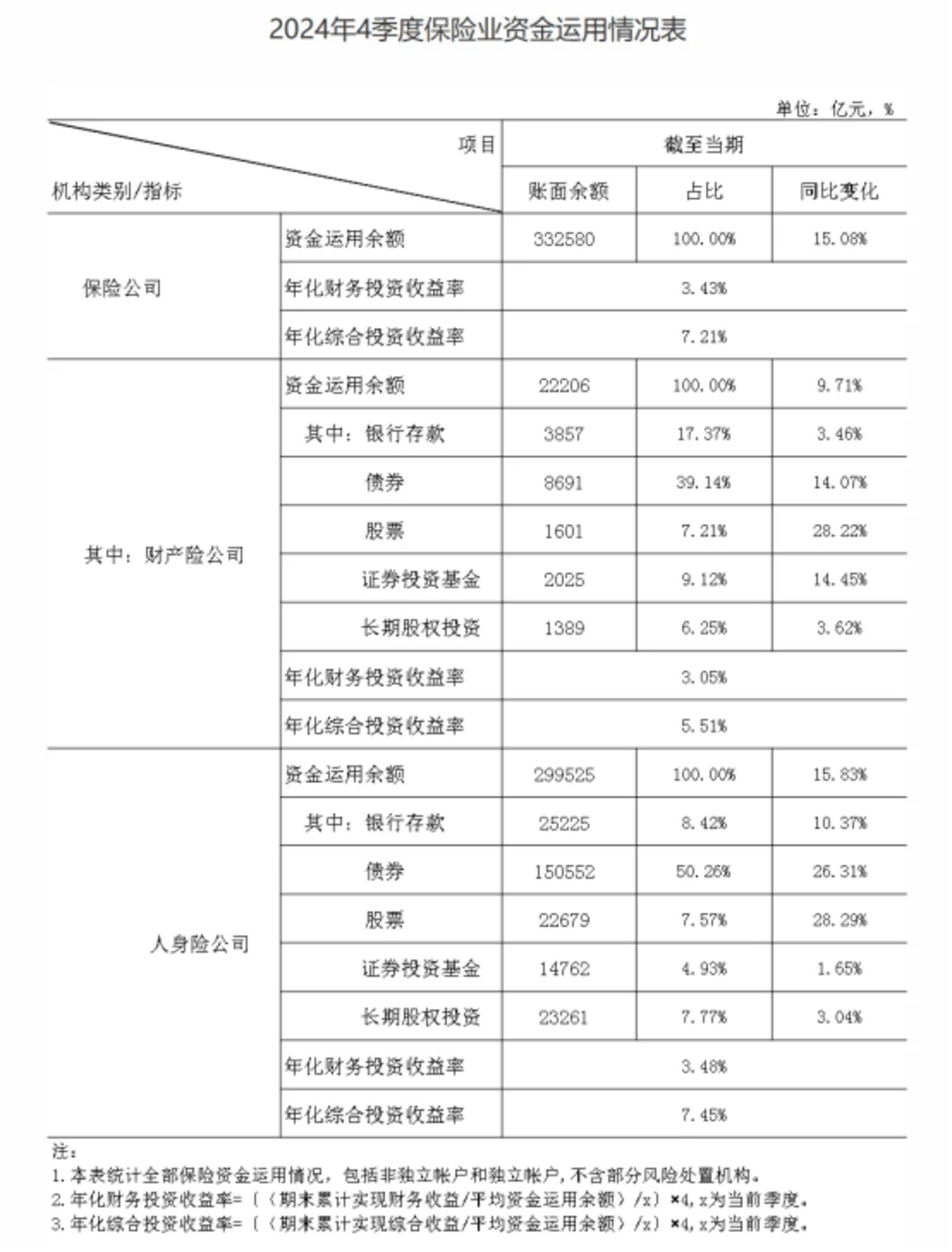 从2024年4季度保险业资金运用情况表来看,人身险公司股票投资2.3万亿,占资金运用余额比7.57%;基金1.47万亿,长期股权投资2.3万亿。