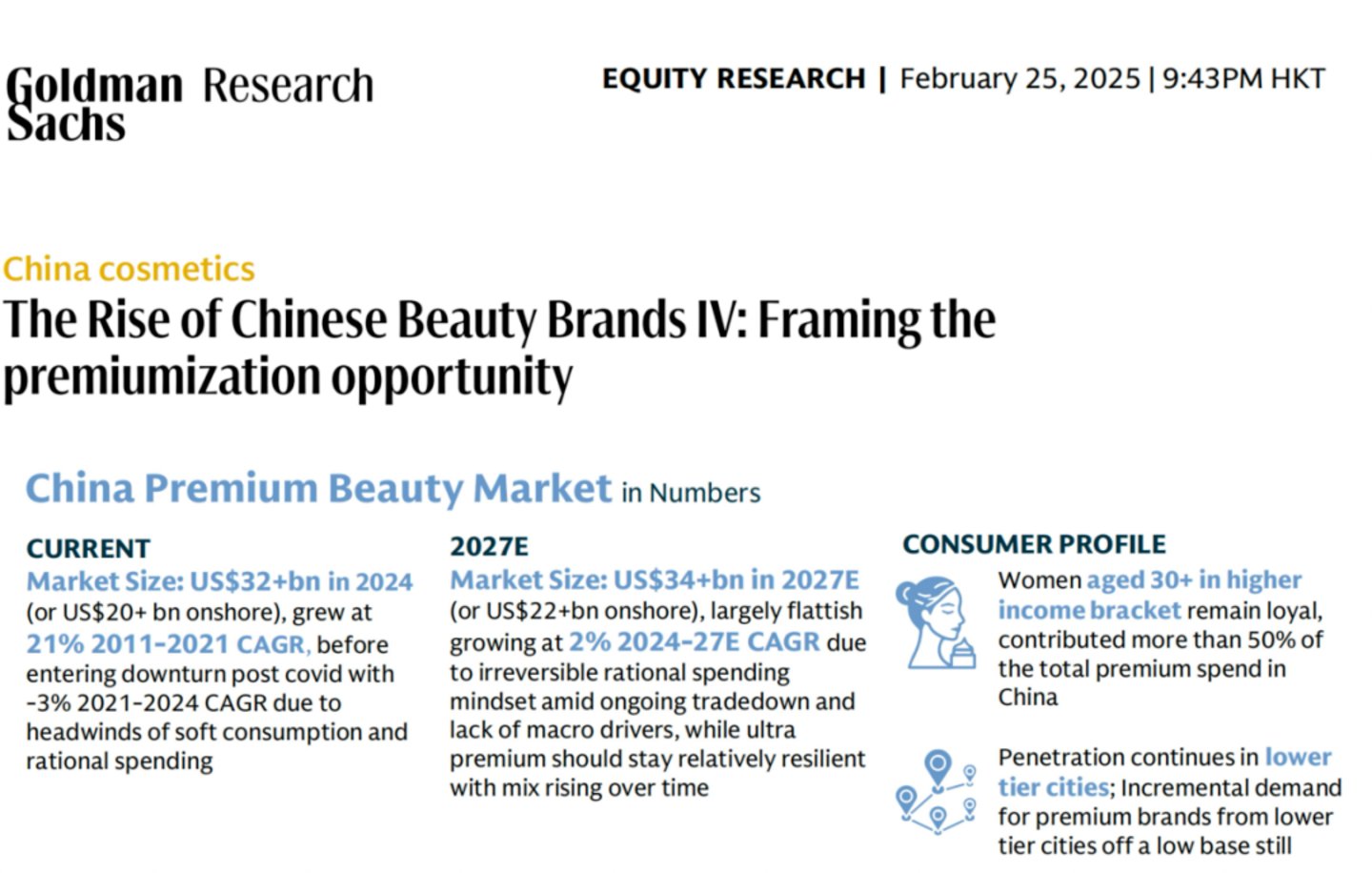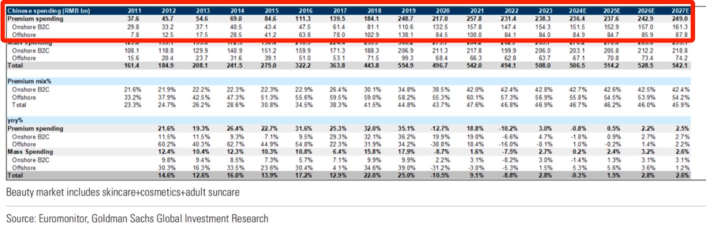 高盛披露,2024年中国高端美妆市场规模为320亿美元(约合人民币2364亿元),到2027年,该市场份额也仅为340亿美元(约合人民币2461亿元)。