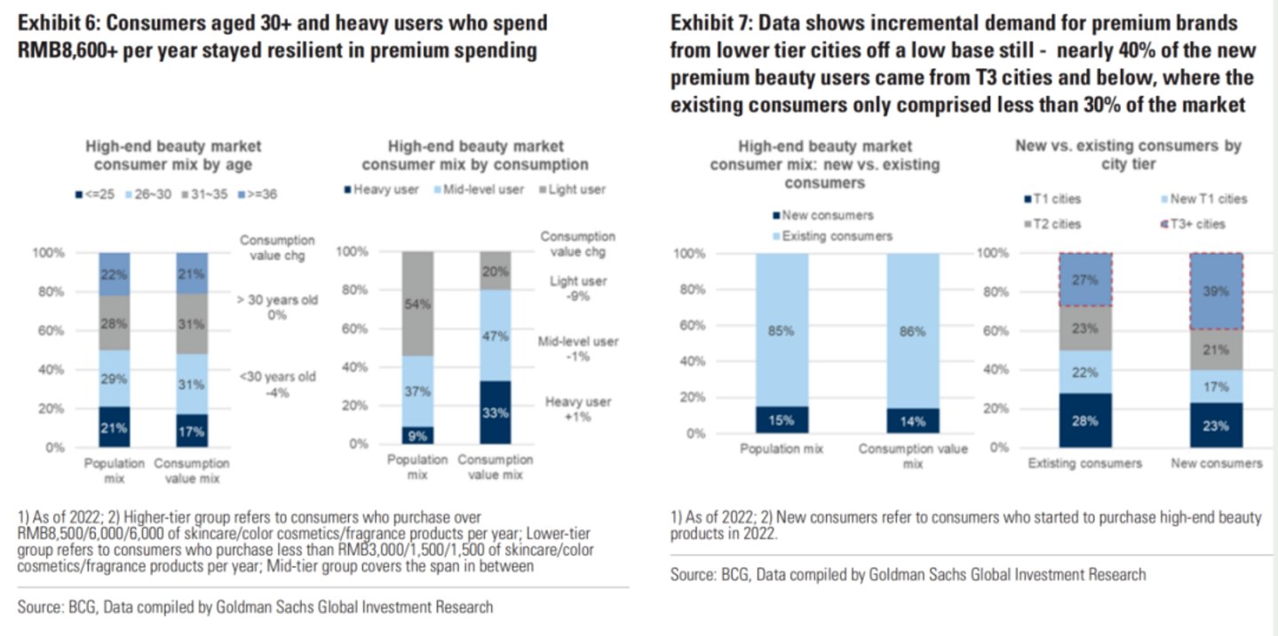 ▲高端美妆消费在不同年龄、不同城市人群的占比。截自高盛研究报告