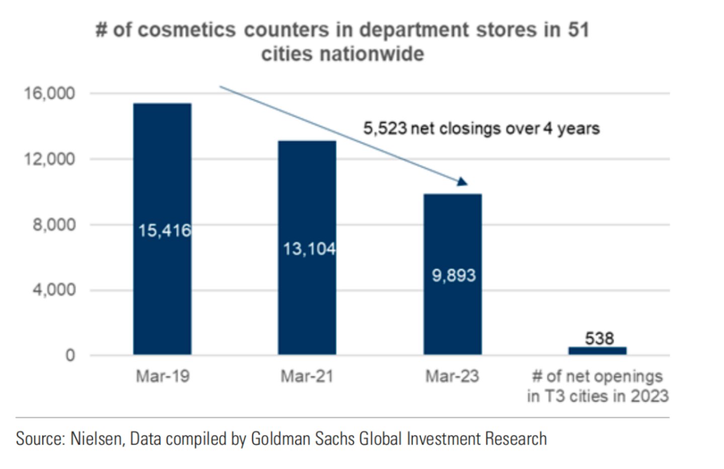 ▲全国 51 个城市的百货商店中的化妆品专柜数量。截自高盛研究报告
