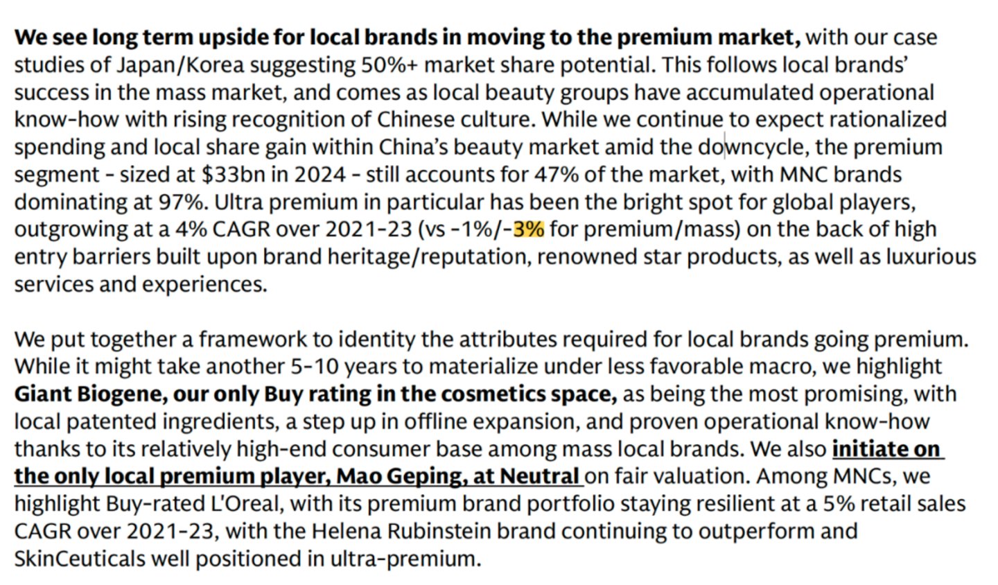 高盛指出,在当下的中国美妆企业中,毛戈平已抢占了部分市场,迪奥Dior、纪梵希Givenchy和阿玛尼Armani在彩妆领域的份额正被本土品牌如毛戈平超越。高盛认为,未来,巨子生物这类企业也有抢占高端的潜力。