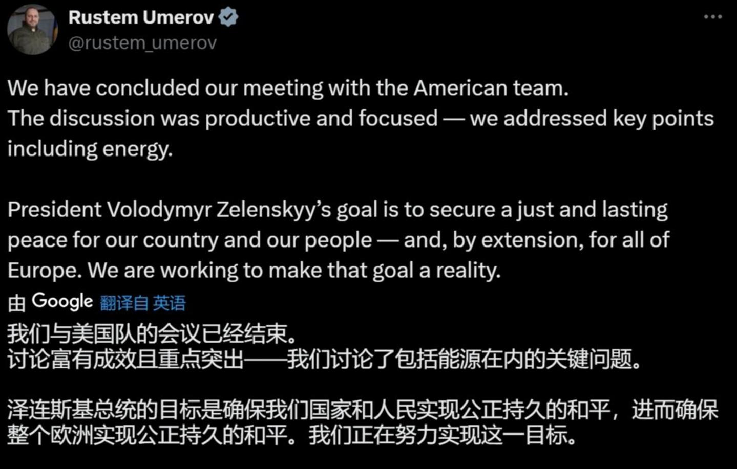 会谈结束后,此次率领乌方代表团的乌克兰国防部长鲁斯特姆·乌梅罗夫(Rustem Umerov)在社交媒体X上发文称与美方的讨论“富有成效且重点突出”,并表示双方讨论了包括能源在内的关键问题,他还称“泽连斯基总统的目标是确保我们国家和人民实现公正持久的和平,进而确保整个欧洲实现公正持久的和平。我们正在努力实现这一目标。”