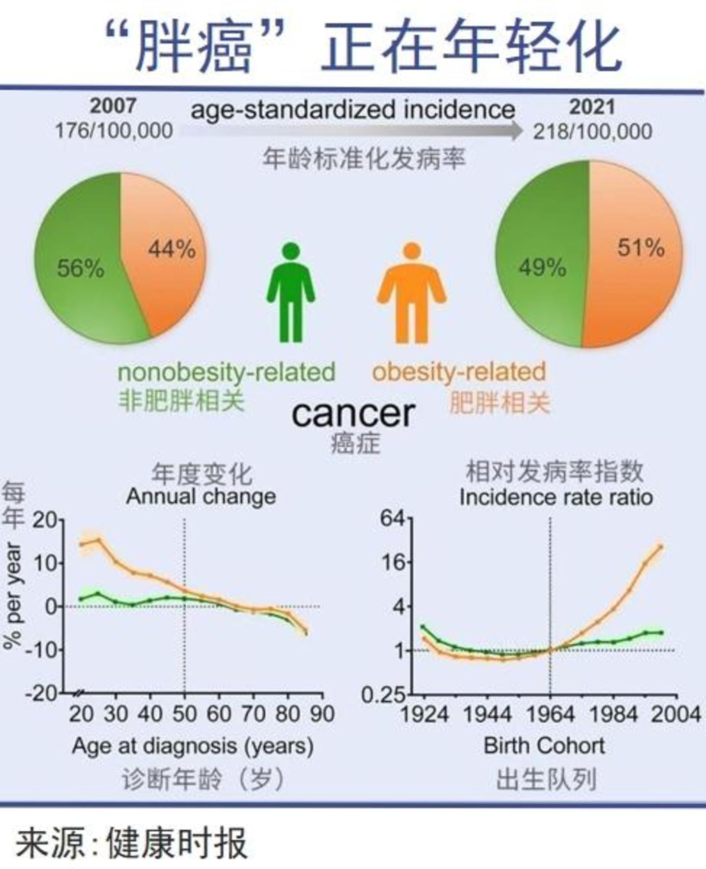 肥胖已成为年轻人健康的一大威胁,许多年轻人在年轻时就受到脂肪肝、高血压等慢性病的困扰,甚至癌症的发病率也在上升。《Med》杂志上的一项研究指出,“胖癌”在年轻群体中的患病率急剧上升,甚至超过了癌症发病率更高的老年群体。例如,25-29岁年龄段的患病率高达15.28%,远高于60-64岁的1.55%。