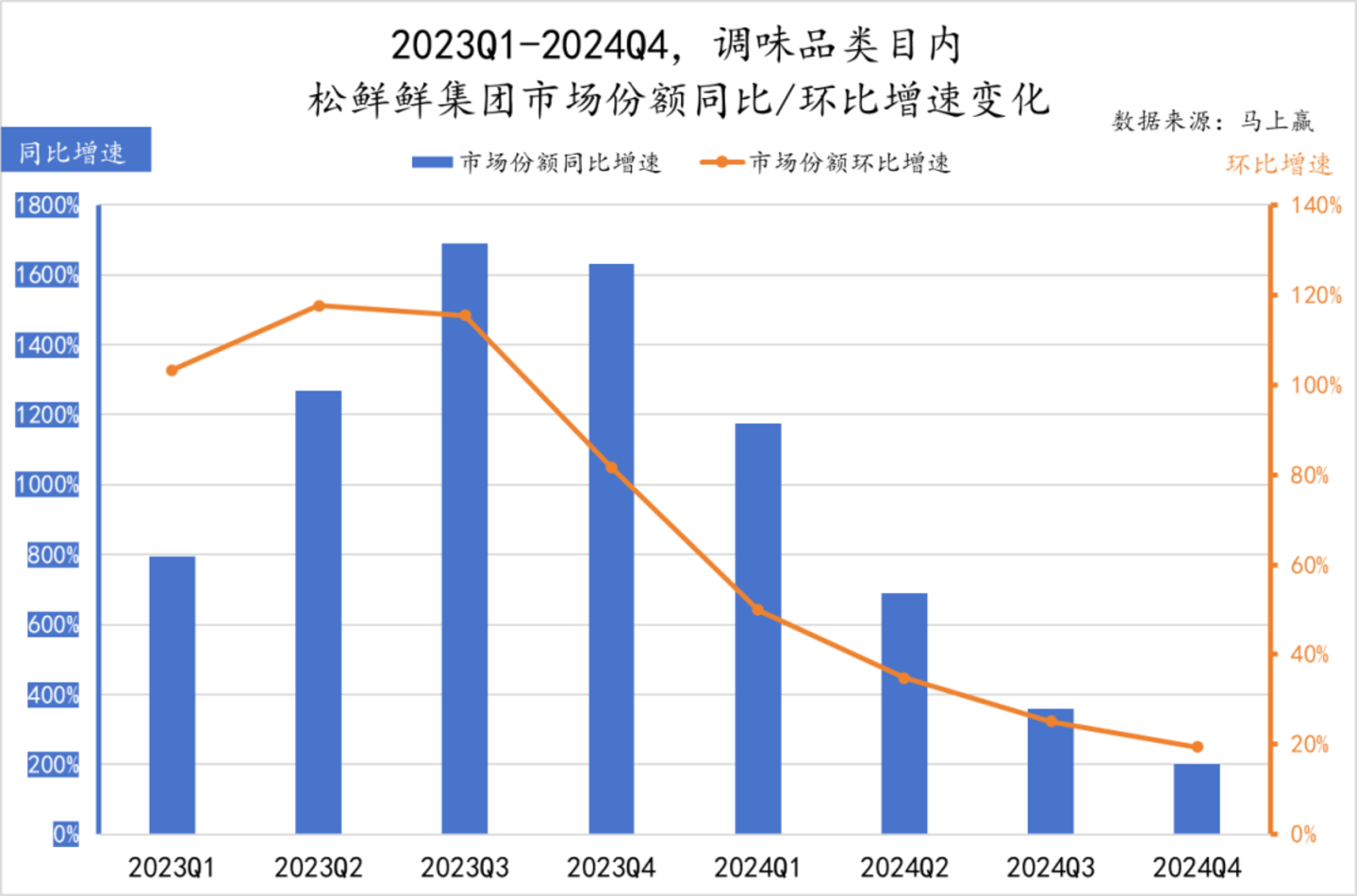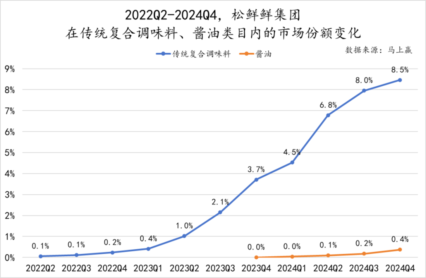马上赢品牌CT中的线下零售监测数据显示,2022、2023年,恰恰成为了松鲜鲜迎风起飞的年份。数据显示,自2023Q1开始,松鲜鲜在传统复合调味料类目中的市场份额便开始“起飞”,至本次事件发生前的上一季度2024Q4,其在传统复合调味料类目中的市场份额已近9%。