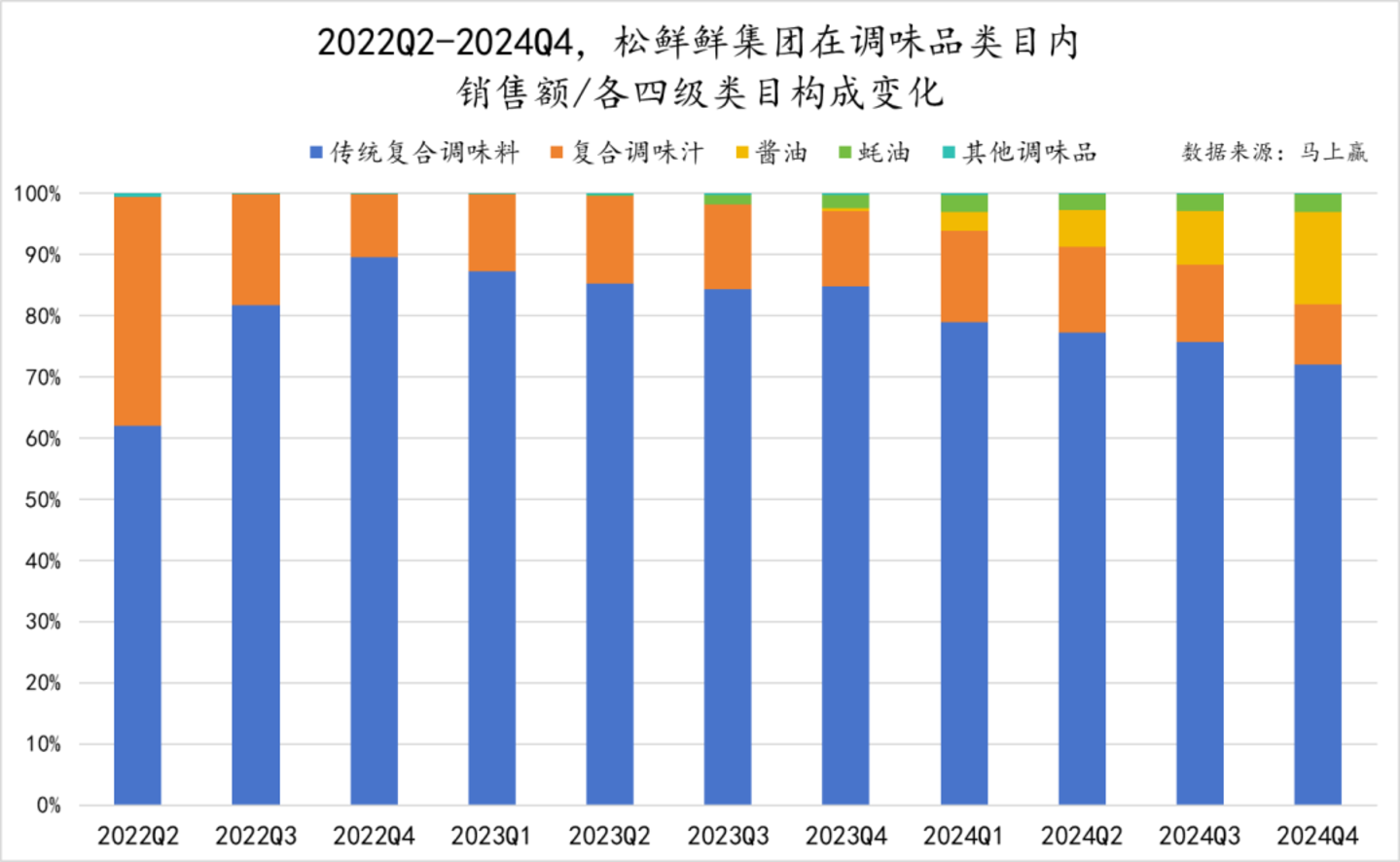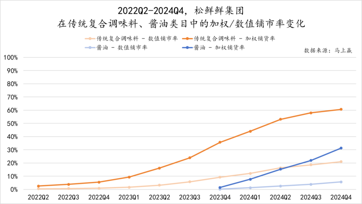但这些动作或许才刚刚起步,基于2022Q2-2024Q4这一时间段,松鲜鲜在调味品类目内的各四级类目销售额构成变化来看,“传统复合调味料”类目的营收占比始终处于松鲜鲜集团的主导地位,即便到2024Q4,其依然贡献了超七成的销售额占比。从趋势上看,松鲜鲜的各四级类目占比中,酱油有着较为显著的提升,然而复合调味汁有着较明显的下降。