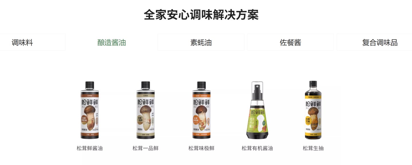 到底是什么推动了松茸概念的起飞?从松鲜鲜的经验来看,或许是其高级原料背后带来的自然/健康/安心,以及与食品安全、配料表清洁的大潮流相吻合,在不断托举着这一类型产品的“量价齐升”。从松鲜鲜产品官网中的介绍也可以看到,松鲜鲜的产品矩阵,整体冠名为“全家安心调味解决方案”,在这一解决方案框架下,产品系列包括调味料、酿造酱油、素蚝油等,在各产品系列下,则是各种冠以“松茸”的产品。