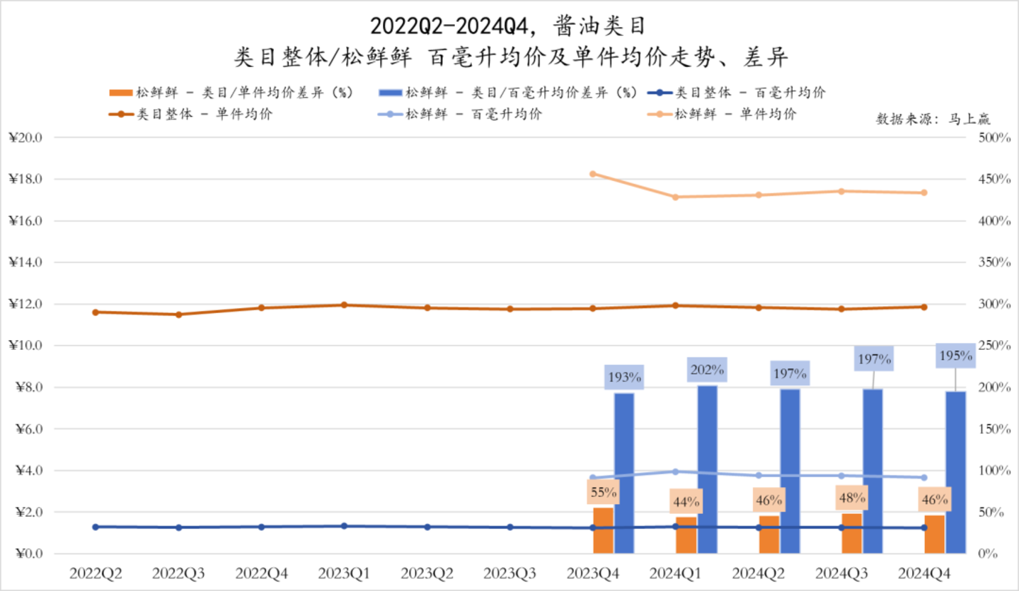 如果说在传统复合调味料类目中,松鲜鲜发起并推动的“松茸”概念让类目整体都迎来了“升级”,其高于类目150%的均价水平是对创新者的“奖赏”,那对于松鲜鲜在其后进入的酱油类目中的“高位定价”,则完全是松鲜鲜对自己高端品牌定位的“诠释”。
