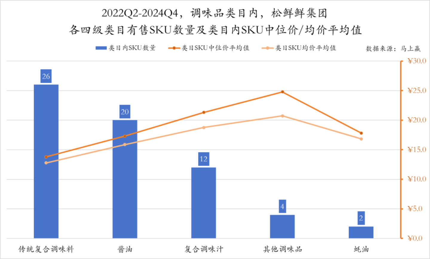从松鲜鲜的有售SKU构成来看,松鲜鲜在非核心类目的拓展仍处于初期阶段。2022Q2至2024Q4期间,其在“传统复合调味料”中累计共有26款SKU有售,酱油类目排名第二,共20款SKU有售,其余复合调味汁、其他调味品、蚝油等,SKU数量目前还较少。另一个值得注意的是,不论是传统复合调味料、还是酱油、复合调味汁,松鲜鲜旗下产品的SKU中位价平均值、均价平均值均在15元左右甚至更高,这一数值对于调味品中的各种类目都可以算得上是一个偏高端的值,或许这也彰显了松鲜鲜只做安心、高端的决心。