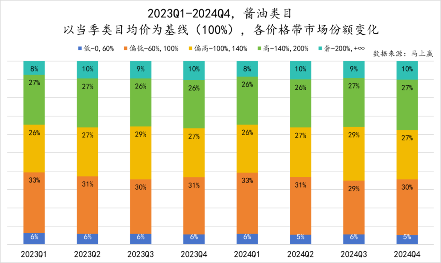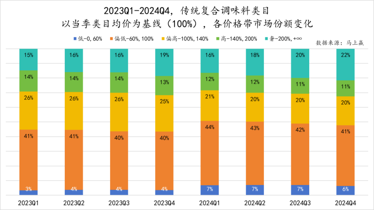 酱油的情况则相对来讲更加稳固,变化更少一些。趋势上看,各个价格带的占比都没有太多的变化,奢侈(均价200%+)定价的产品市场份额有轻微的提升,但并不算显著。相比传统复合调味料来说,酱油类目的规模要更大,面对的传统产品与格局也更多。