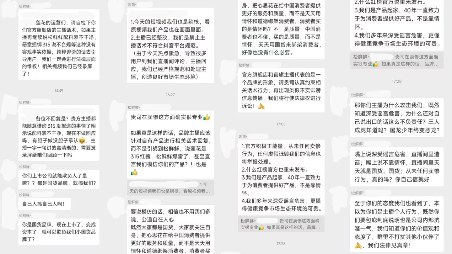 其一是一张来自于消息人士提供的截图,截图中显示在某个电商群中,来自松鲜鲜与莲花店铺运营相关人员的争吵,右侧图则是松鲜鲜公众号中,关于希望“某前辈”停手的暗示。
