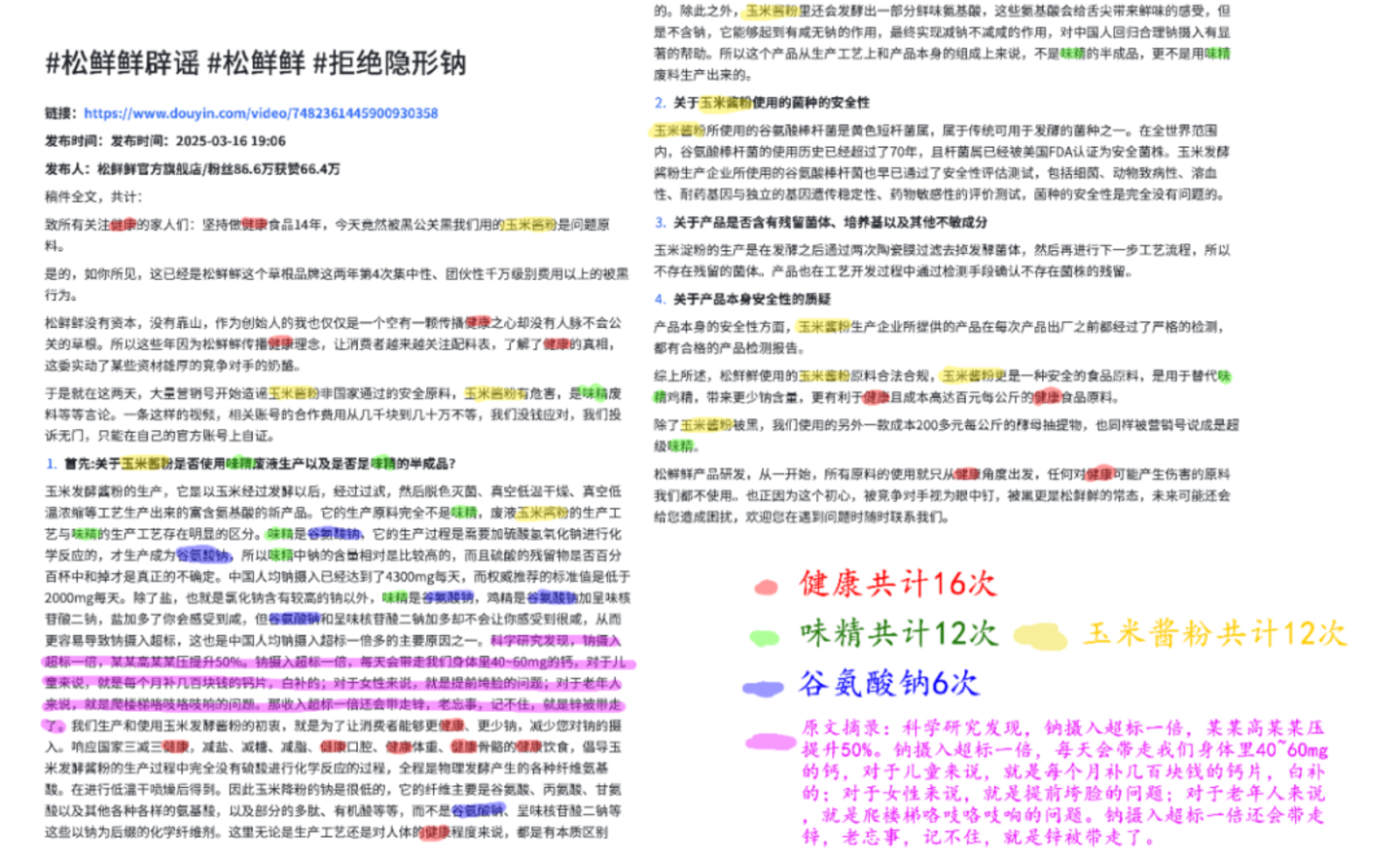 其二则是公开资料,来自松鲜鲜创始人易子涵的辟谣视频,由松鲜鲜官方旗舰店账号于2025-03-16 19:06发出,目前依然可见,视频标题为:#松鲜鲜辟谣 #松鲜鲜 #拒绝隐形钠。马上赢情报站将该视频中的文字内容进行了文本化,并通过词频标记了出现前几名的词,词频如下: