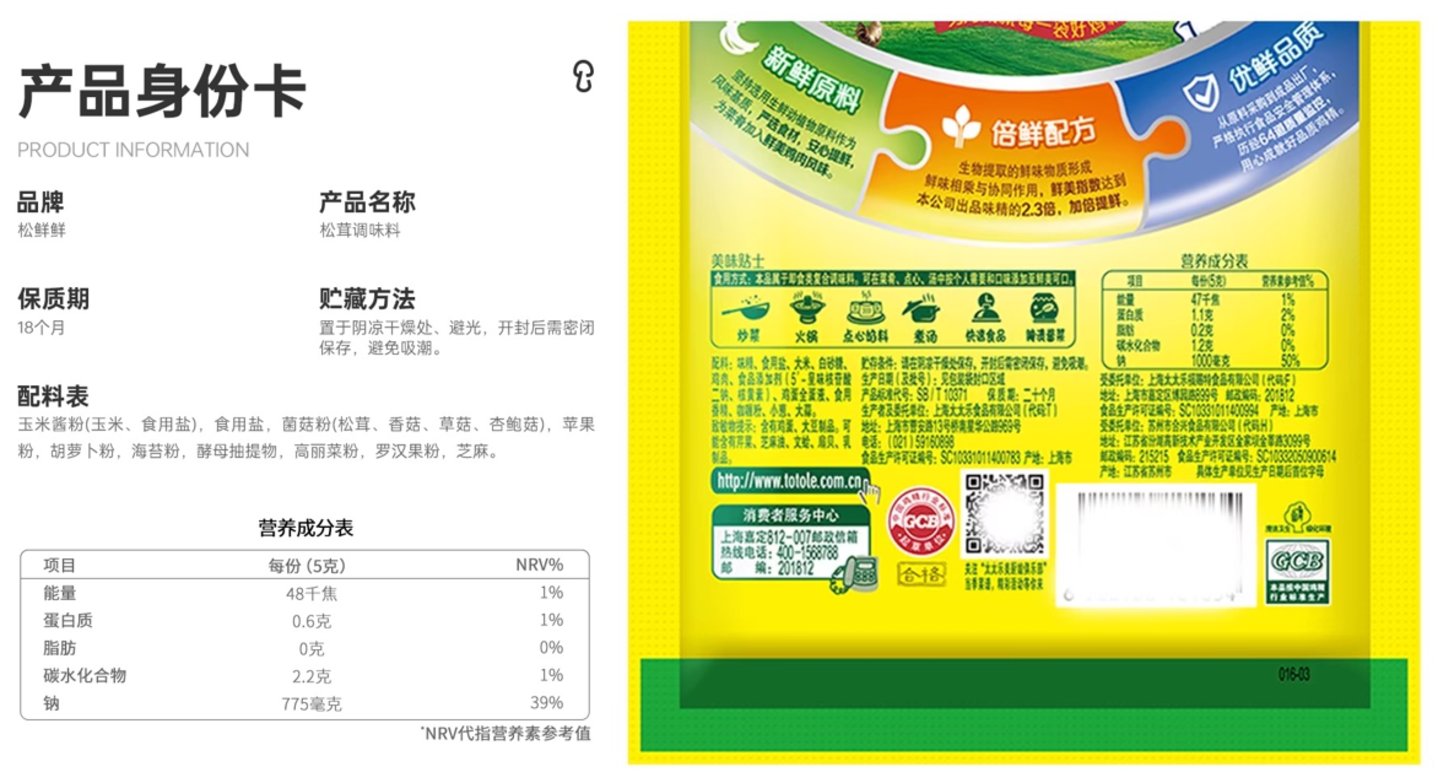 松鲜鲜松茸鲜配料表(左)、太太乐三鲜鸡精调味料配料表(右)图片来源:天猫