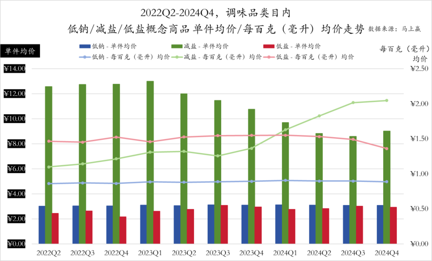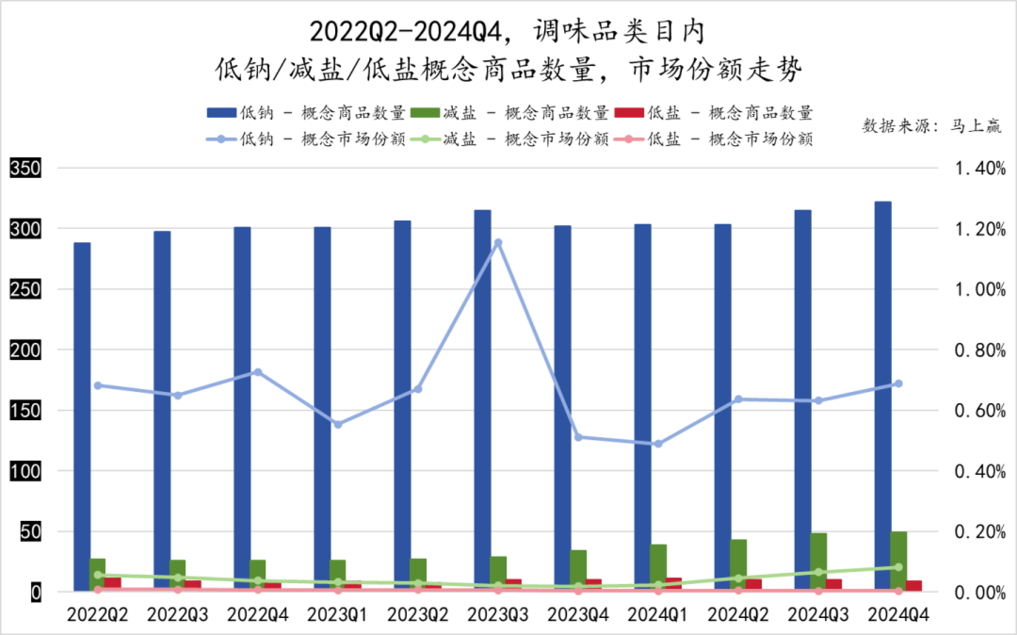 同样基于马上赢品牌CT中调味品类目内的数据,以“低钠”、“减盐”、“低盐”为关键词对类目内产品进行检索分类并形成概念产品集合,从低钠/减盐/低盐这一组概念的市场份额以及产品数量走势来看,2022Q2-2024Q4,低钠概念整体产品供给数量平均,至少未见非常显著的增长。从市场份额的变化上来看,低钠概念除了2023Q3有一次高峰外,其余时间整体不温不火,甚至前后还有些许下滑的迹象。基于实际情况分析,低钠概念更多出现在盐这一类型产品中,而23Q3时曾经爆发过一次“抢盐风波”,拉动盐在整体调味品类目中的份额同时形成了概念市场份额的峰值,并非常规概念产品增长推动的市场份额增长。
