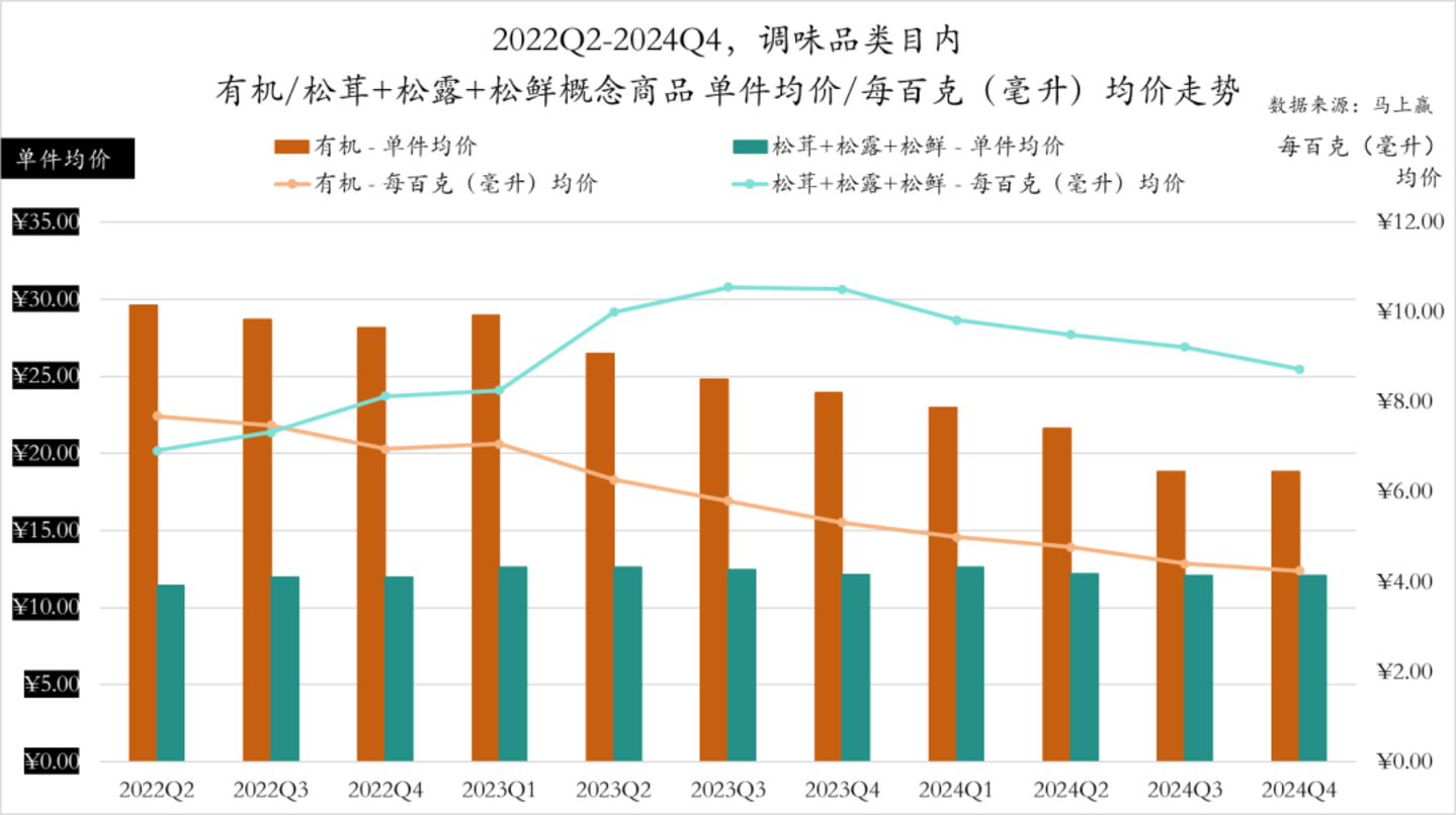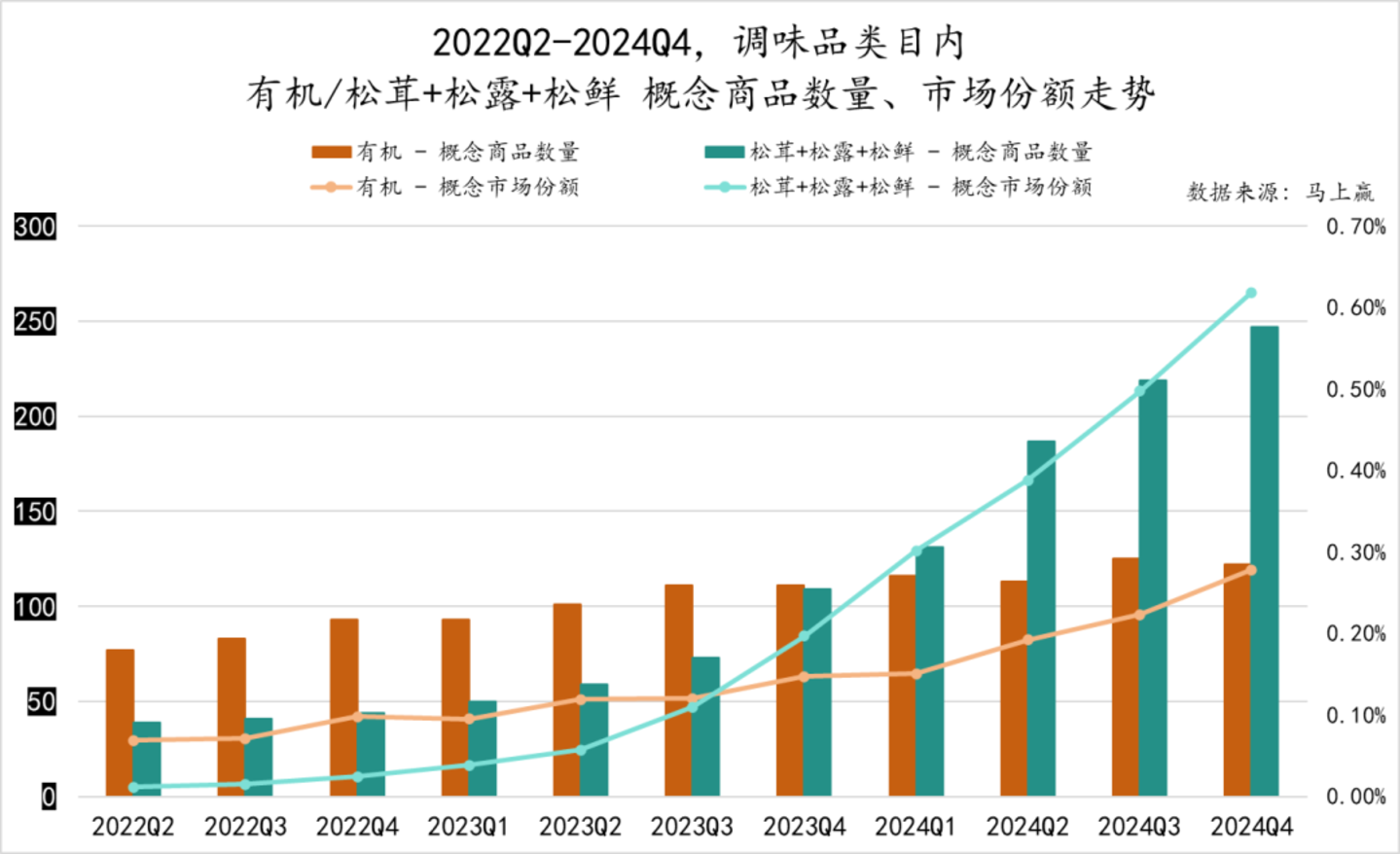 同样是来自于“高级原料”这一产品概念,基于马上赢品牌CT中,调味品类目内,我们抓取了松茸系列概念,以及更加普适的“有机”概念。可以看到,自2022Q2-2024Q4,相比于不温不火的有机概念,松茸系列概念真真正正在产品数量、市场份额上迎来了“起飞”,而这一起飞的时间段,也与上文中松鲜鲜市场份额起飞的时间段,基本保持了亦步亦趋。