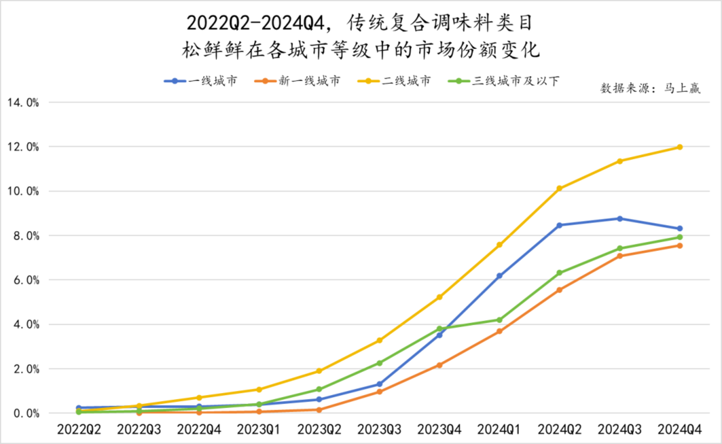 在松鲜鲜起家的传统复合调味料类目中,松鲜鲜在各城市等级中在类目中的市场份额,从2023Q1-2024Q4均呈现较明显的涨势,除了2024Q3-2024Q4期间的一线城市等级市场。