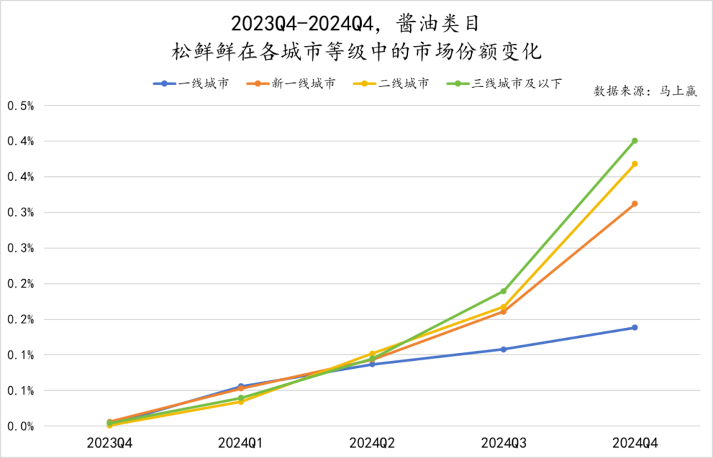 在酱油类目中,松鲜鲜由于进入该类目时间较晚,市场份额也相对较小,所以整体增速还处于高速增长的阶段中。但与其在传统复合调味料类目中的问题一致,其在一线城市等级市场中的表现与其他三个等级市场中的表现差异较大。